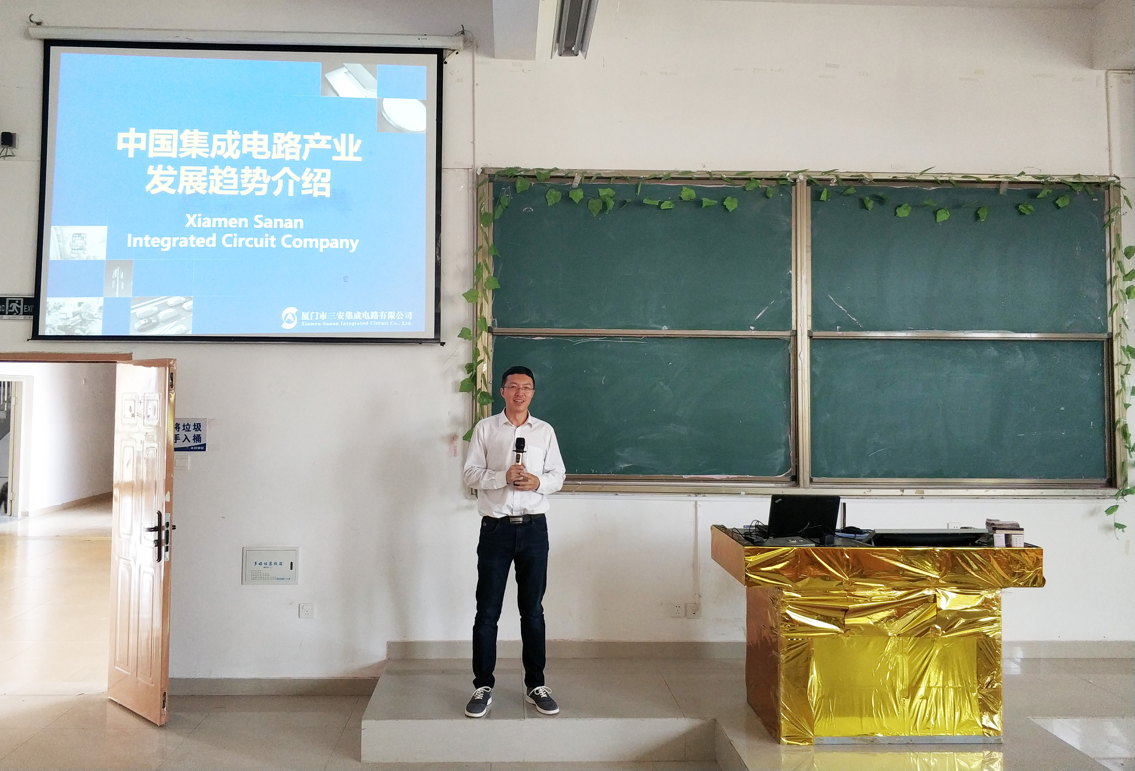 4月9日,厦门三安集成电路有限公司制造部副经理洪常峰等一行到我院开展专业宣讲活动。信息工程系党政办主任谢延凯、电子教研室主任陈贤章等相关专业教师参加了宣讲会,电子、通信专业共计150名同学到场聆听。