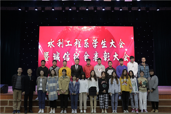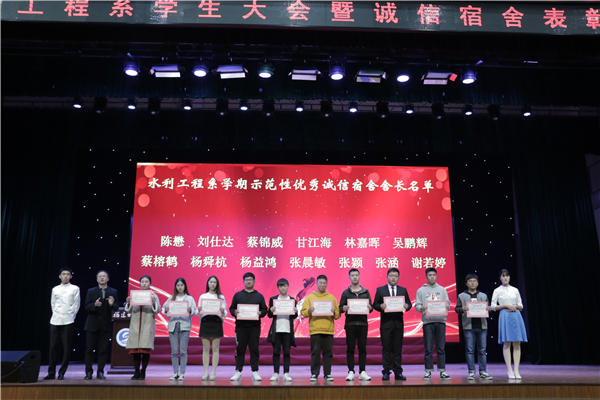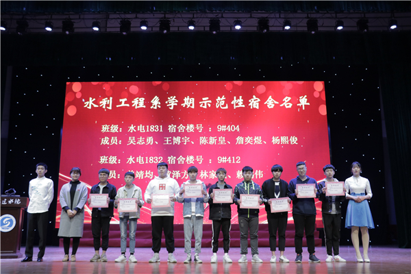 庄娟瑜宣读了《关于表彰2018-2019学年第一学期水利工程系“学期诚信宿舍”的决定》,授予1-314等13个宿舍为水利工程系“学期诚信宿舍”称号。“学期诚信宿舍”优秀舍长代表、水电1732班甘江海同学作获奖感言,他感谢水利系对学生自律自觉的信任,承诺从点滴做起、继续前行,并号召全系同学们加入到创建诚信宿舍的队伍中去。