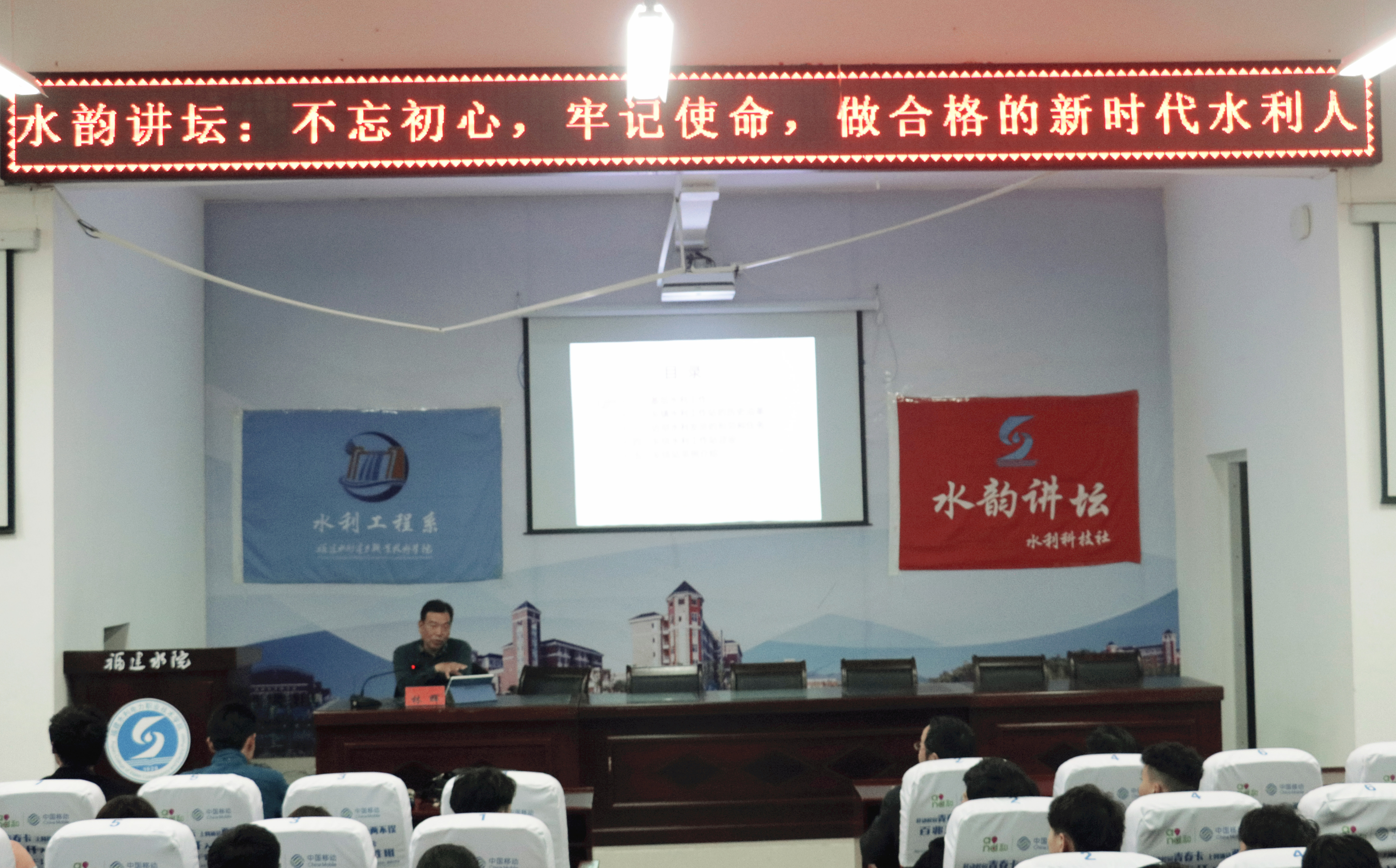 3月14日下午,水利工程系邀请我院退休教师高级工程师林辉在禹兴园3-D02为系里师生们开展 “不忘初心,牢记使命,做合格的新时代水利人”讲座。全系党员教师、专兼职辅导员及学生代表共300多人到场聆听。讲座由水利工程系团总支书记庄娟瑜主持。