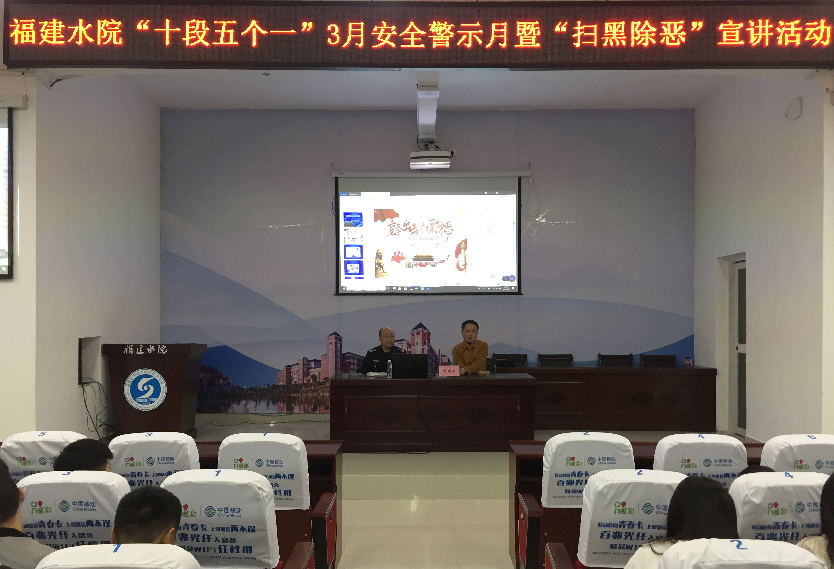 为深入贯彻党中央关于开展“扫黑除恶”专项斗争的工作要求,进一步增强我院师生扫黑除恶专项斗争的责任感和使命感,3月21日晚,保卫处以视频直播方式在学术报告厅和各系部班级教室开展了“扫黑除恶”专项斗争宣讲活动,保卫处全体成员、各系部团总支书记、专兼职辅导员及在校全体学生参加了宣讲活动。宣讲活动由永安市公安局燕南派出所副所长李新旺主讲,保卫处处长刘文辉主持。