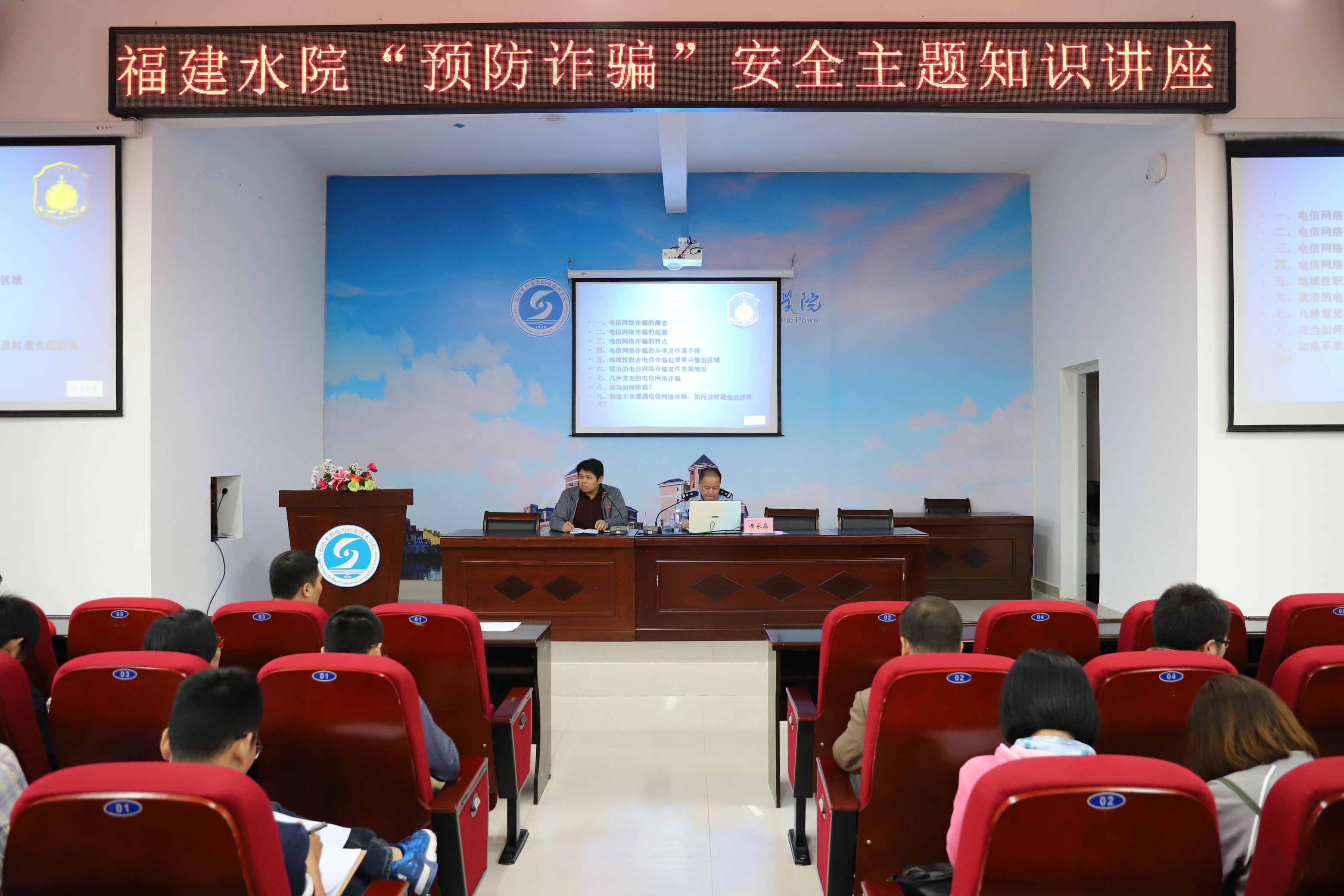 10月17日下午,学院在禹兴园1-312学术报告厅开展“预防诈骗”安全主题知识讲座。会议邀请了永安市公安局刑侦大队诈骗中队指导员黄永淼主讲,保卫处、学生工作处全体人员、各系部党团总支负责人、全体专兼职辅导员、及学生代表共计300余人参加,会议由保卫处副处长马东周主持。