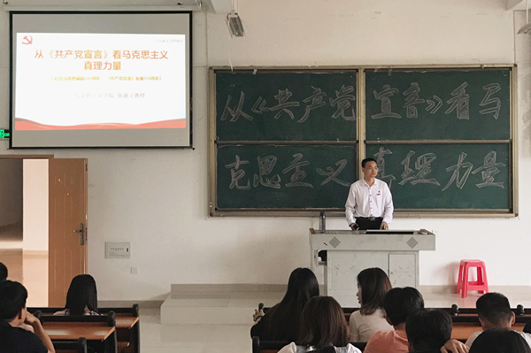 为纪念马克思诞辰200周年和《共产党宣言》发表170周年,6月7日下午,马克思主义学院院长张盛文教授为“习近平新时代中国特色社会主义思想读书社”全体师生共计160余人开设了一场题为《从< 共产党宣言>看马克思主义真理力量》的专题讲座。