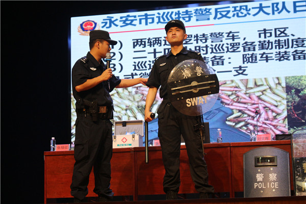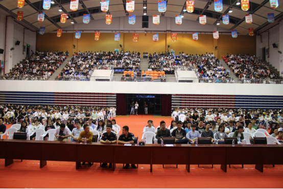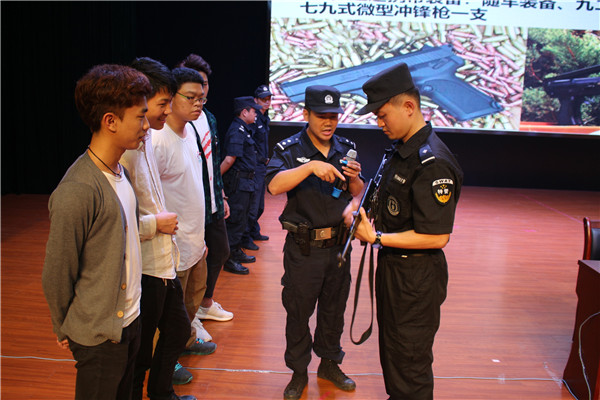 次日晚,反恐大队民警在路港体育教学馆为2017级学生共2000余人开设了一场“反恐防暴”知识讲座。讲座中,聂警官首先运用详实的暴恐案例图片,说明了恐怖主义、恐怖活动、恐怖组织的定义和危害,并通过观看视频,详细阐述了恐怖活动的总体情况及特征;最后,重点讲解了《中华人民共和国反恐怖主义法》的章节要点,全面细致讲解了在不同场所遭遇爆炸、枪击、砍杀、纵火等恐怖袭击时的自我保护和自救互救方法。阙警官还以过硬的专业技能,在现场展示和讲解了反恐武器的使用范畴与使用方法,并邀请师生代表上台体验。