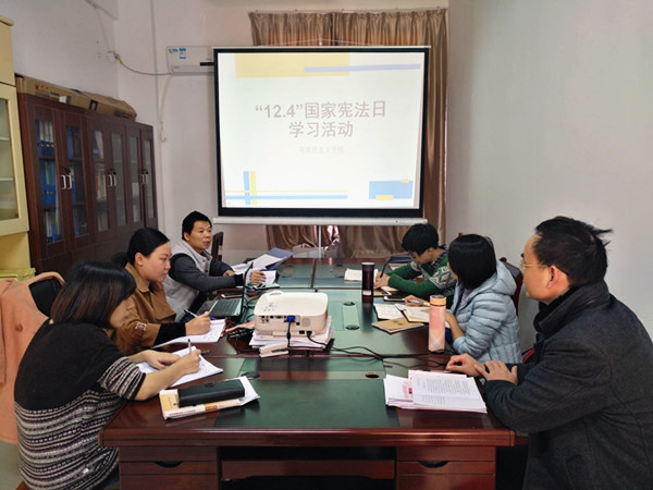 此外,马克思主义学院还组织开展宪法学习讨论会。会上,全体教师回顾了党的十九大报告中习近平总书记关于全面依法治国的重要论述,共同学习了宪法知识、新修订的党章以及学院章程规定等内容,并围绕如何增强自身法律素养、如何依托思政课堂开展形式丰富多样的法制教育展开热烈的讨论。