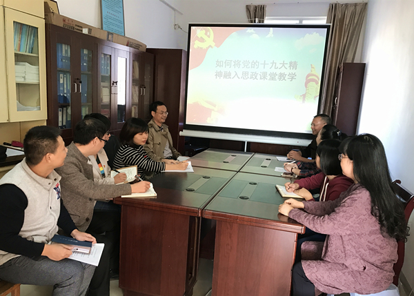 活动中,教师们各抒己见,讨论热烈,就十九大融入思政教学畅谈了各自的看法。一是作为思想政治理论课一线教师,我们只有先学一步、学深一步才能更好地把党的十九大精神融入课堂;二是注重融入,以课堂为载体,深挖十九大精神的实质,将十九大精神与教学内容进行无缝对接;三是结合教学知识点,紧扣社会现实和学生的思想实际,通过丰富的教学方式,深入浅出地将十九大的精神讲透彻、讲生动。