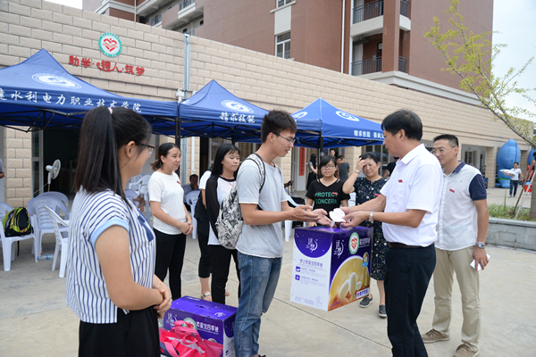 (党委书记庄伟廉为新生送上爱心资助卡和爱心礼包)