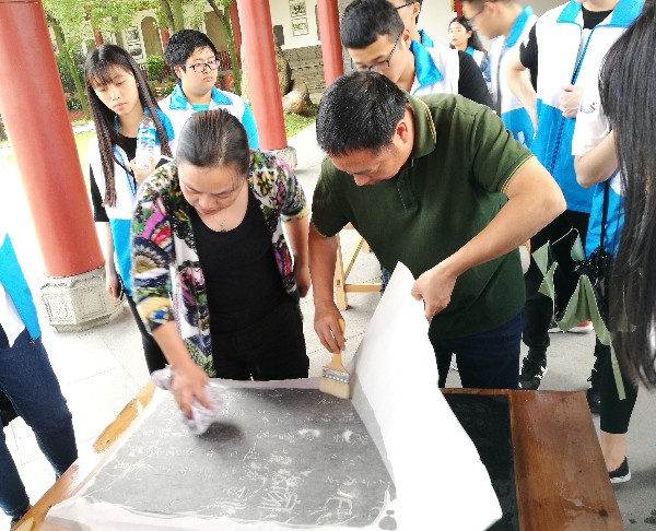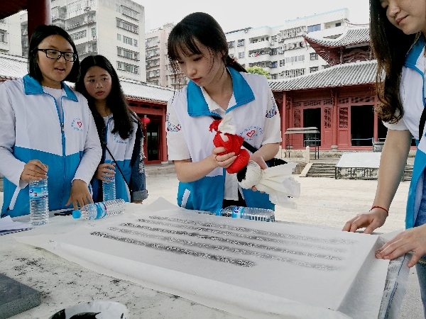 在博物馆刚刚启动的“拓片”活动中,博物馆罗馆长与工作人员在长廊上认真演示“拓片”流程,清洗、上宣纸、压实、蘸墨……,每个环节都要求做到精益求精。同学们聚精会神地观摩了每个细节,并纷纷动手进行了实践操作。半小时过去,尽管大家首次操作的“拓片”作品还不够精致,却收获满满。大家在赞叹古人的聪明才智之余,也体会到了传统技艺独具匠心的工匠精神。