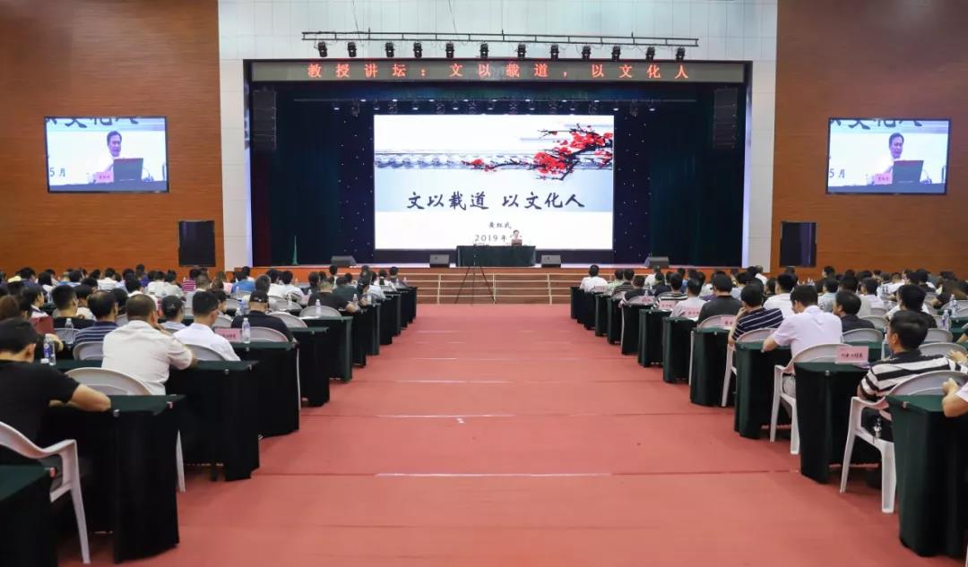 为深入学习习近平总书记重要讲话精神,强化思想理论教育和价值引领,推进传承弘扬中华优秀传统文化工作,6月14日下午,学院“教授讲坛”特邀省委委员、省政协常委、省政协教科文卫体专委会主任黄红武教授莅临福建水利电力职业技术学院,在路港体育教学馆为全院师生作了一场题为《文以载道 以文化人》的专题讲座。学院全体教职工及学生代表近千人到场聆听,讲座由学院党委书记庄伟廉主持。