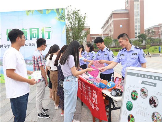 活动现场还设置了毒品仿真样品展示区、吸毒模拟场景体验区、签名墙和宣传品发放区,让现场人员深切体会到毒品给人类带来的极大危害。最后,师生通过健康环人工湖跑,身体力行向毒品说“不”。