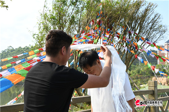 风吹经幡,送上吉祥。根据悬挂经幡的流程,大家齐心协力,将经幡固定在天鹅湖畔的小叶榕树上,寓意着全国各地的莘莘学子汇聚在一起,根植在福建水利电力职业技术学院这片美丽的圣土上茁壮成长。随后,现场师生互赠了哈达,并跳起了欢快的藏族舞蹈。