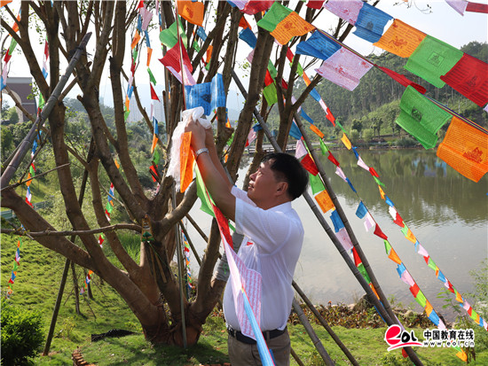 党委书记庄伟廉亲手将经幡布一条接一条地捆绑在一起,他动情地说道,学校就像一个民族融合的大家庭,今天的经幡不仅为校园文化增添了一道绚丽的风景线,更体现了与我们的水文化兼容并包的校园文化特色,是学校汲取优秀民族文化交融发展的体现,意义重大,希望能够长久地多举办具有民族特色的活动,让各民族的友谊在学院生根发芽、茁壮成长。