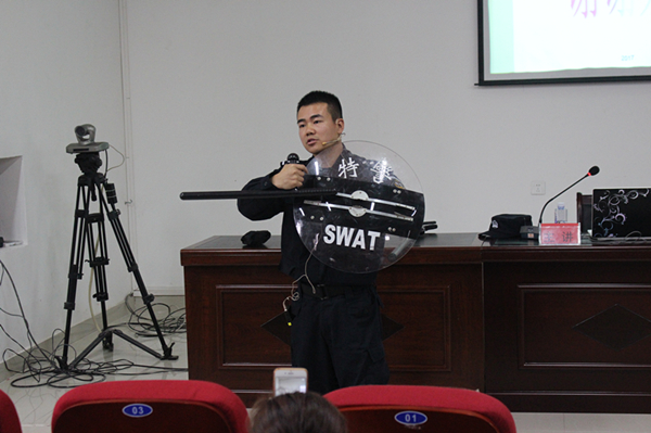 讲座中,永安市特警反恐大队阙警官首先运用详实的暴恐案例图片和视频,详细阐述恐怖主义、恐怖活动、恐怖组织的定义和危害,以及恐怖活动的总体情况及特征,重点讲解《中华人民共和国反恐怖主义法》的章节要点,全面细致讲解在不同场所遭遇爆炸、枪击、砍杀、纵火等恐怖袭击时的自我保护和自救互救方法,并在现场展示和讲解了反恐武器的使用范畴与使用方法。