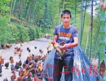 距永安市青水畲乡青水村村部4公里,是村民钟家大的林下养鸡场。成群结队的土鸡,在林地里自由奔跑,快乐觅食。令人新奇的是,这里的的土鸡戴着“戒指”——二维码脚环,通过这个“神器”,深山里的土鸡上了网,“飞”向外地。