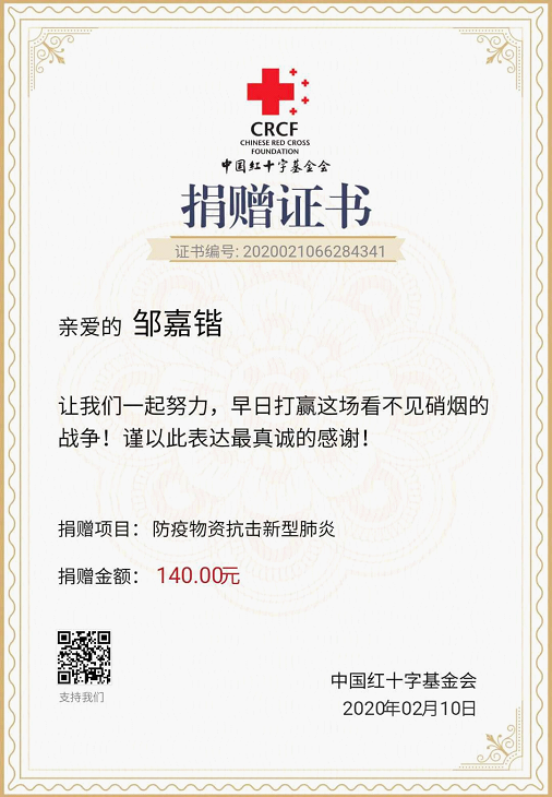 当得知武汉等多地防疫医疗资源紧缺,很多医护人员不顾生命危险依然坚持在防治疫情患者工作一线的消息时,邹嘉锴同学瞒着家人向中国红十字基金会爱心捐款140元,钱数虽然不多,但邹嘉锴同学希望自己的一点爱心能够为广大医护者和疫情患者尽一些绵薄之力。希望广大医护者平安健康,祝愿疫情患者早日康复!