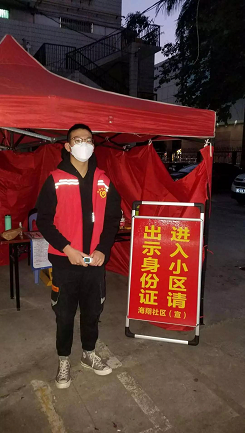 邹嘉锴同学高度关注疫情抗击进展,时刻准备着冲锋抗“疫”前线。家乡社区开展抗疫情志愿服务活动通知一出文,便果断报名,即刻投入抗击疫情志愿服务活动中。2月12日以来,邹嘉锴同学在做好自身安全防护措施下,来回奔走于社区,配合社区工作人员积极做好体温测量,表格登记,政策讲解,站岗执勤等疫情防控工作。数天以来的防疫志愿服务让邹嘉锴同学感受到了防控战役的艰辛不易,但付出的努力得到社区和居民们的认可内心充满自豪感,因为多一道防护措施,社区居民就多一分平安。