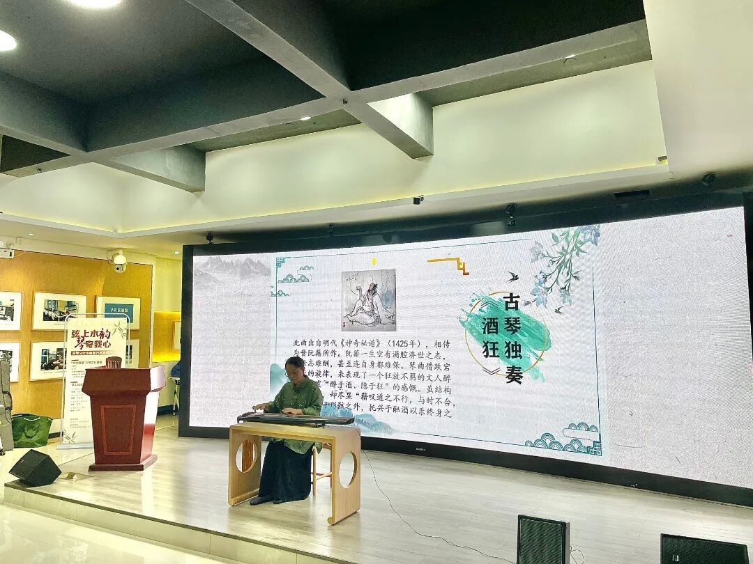 讲座结束后,古琴雅集随即展开。张苓老师首先演奏了《秋风醉》,琴声如秋风拂面,悠远中略带萧瑟,引人入胜;随后一曲《酒狂》,节奏跌宕起伏,意态酣畅淋漓,生动传达出阮籍的疏狂与隐逸;最后,她以现代曲目《大鱼》作结,古琴演绎出空灵悠远的意境,既保留传统韵味,又融入现代气息,赢得现场阵阵掌声。