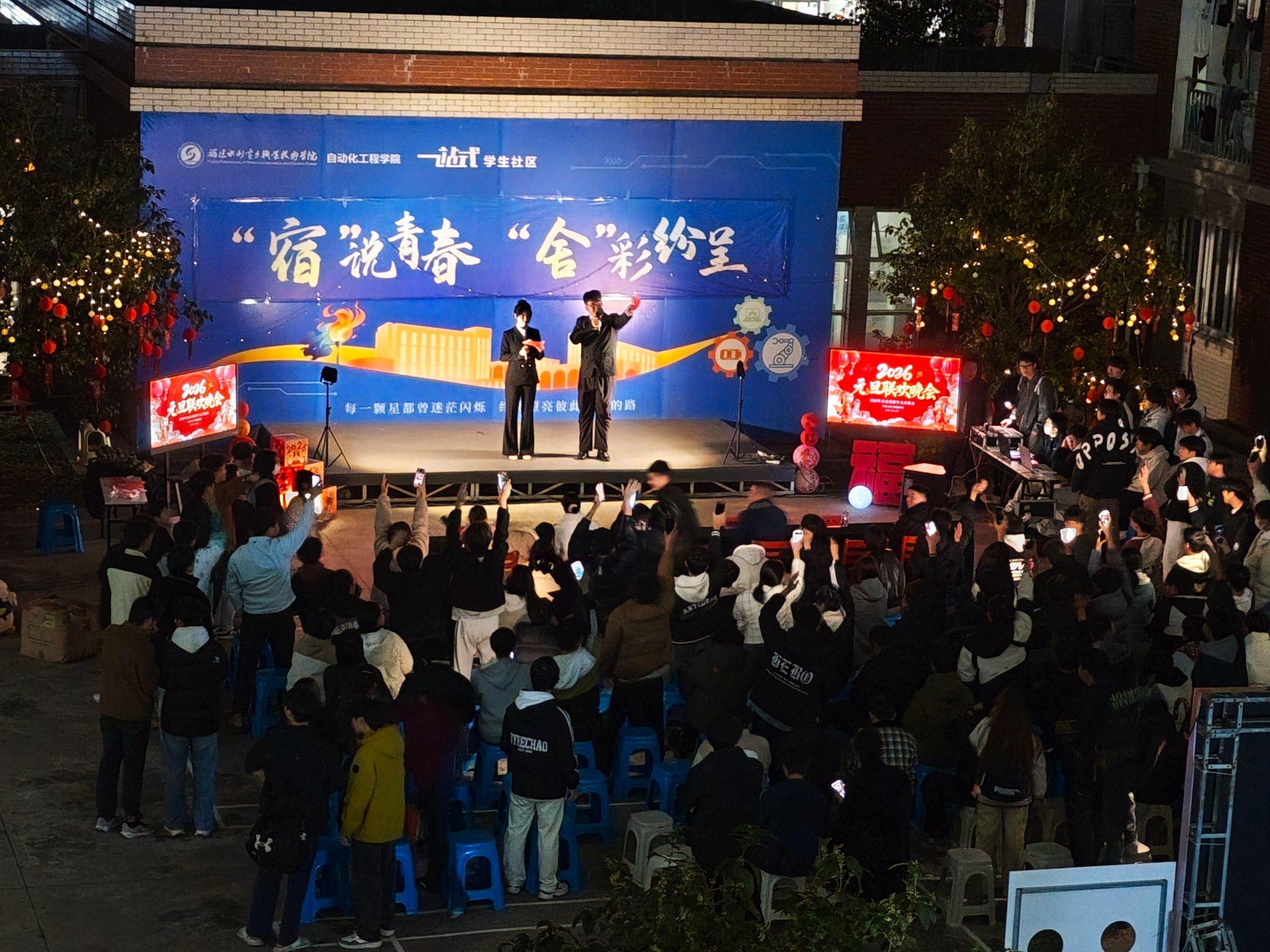 为迎接2026年元旦,丰富“一站式”学生社区文化生活,12月29日晚,自动化工程学院在5-7幢社区广场举办了“青春‘新’火‘熠’路同程”主题元旦联欢晚会。学院师生欢聚一堂,共迎新年,现场气氛温馨热烈。