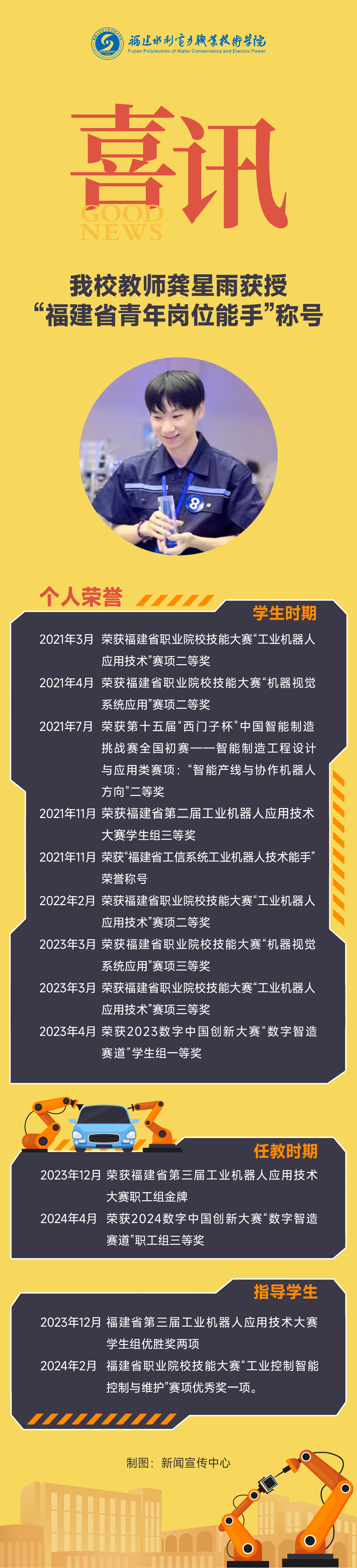 近日,福建省工业和信息化厅与共青团福建省委联合发布《福建省工业和信息化厅 共青团福建省委关于授予林煜等5位同志“福建省青年岗位能手”称号的通知》,我校教师龚星雨成功获授。