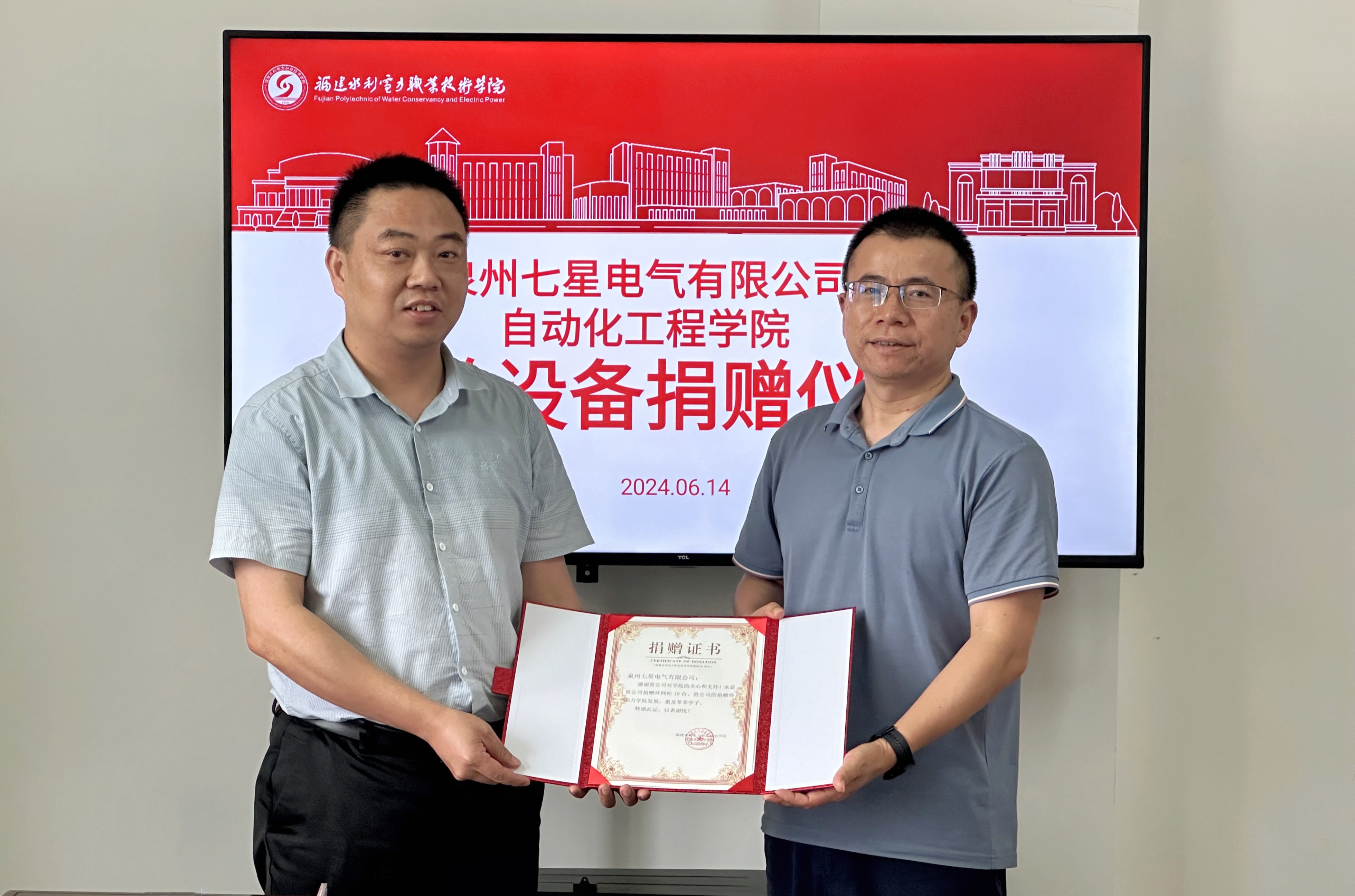 为了满足供配电相关实验实训教学需求,助力学生技能培养,泉州七星电气有限公司向我院捐赠10台环网柜,价值20万元。6月14日,在自动化工程学院举行了泉州七星电气有限公司实验设备捐赠仪式。七星电气人事部经理黄其昌、质检部经理刘志强、技术部经理张运林,自动化工程学院书记祁建斌、电气教研室副主任孙黎及专业老师代表参加了会议。