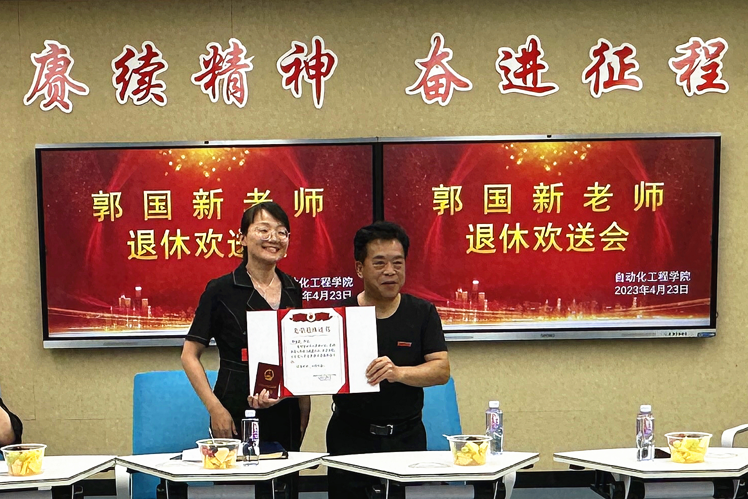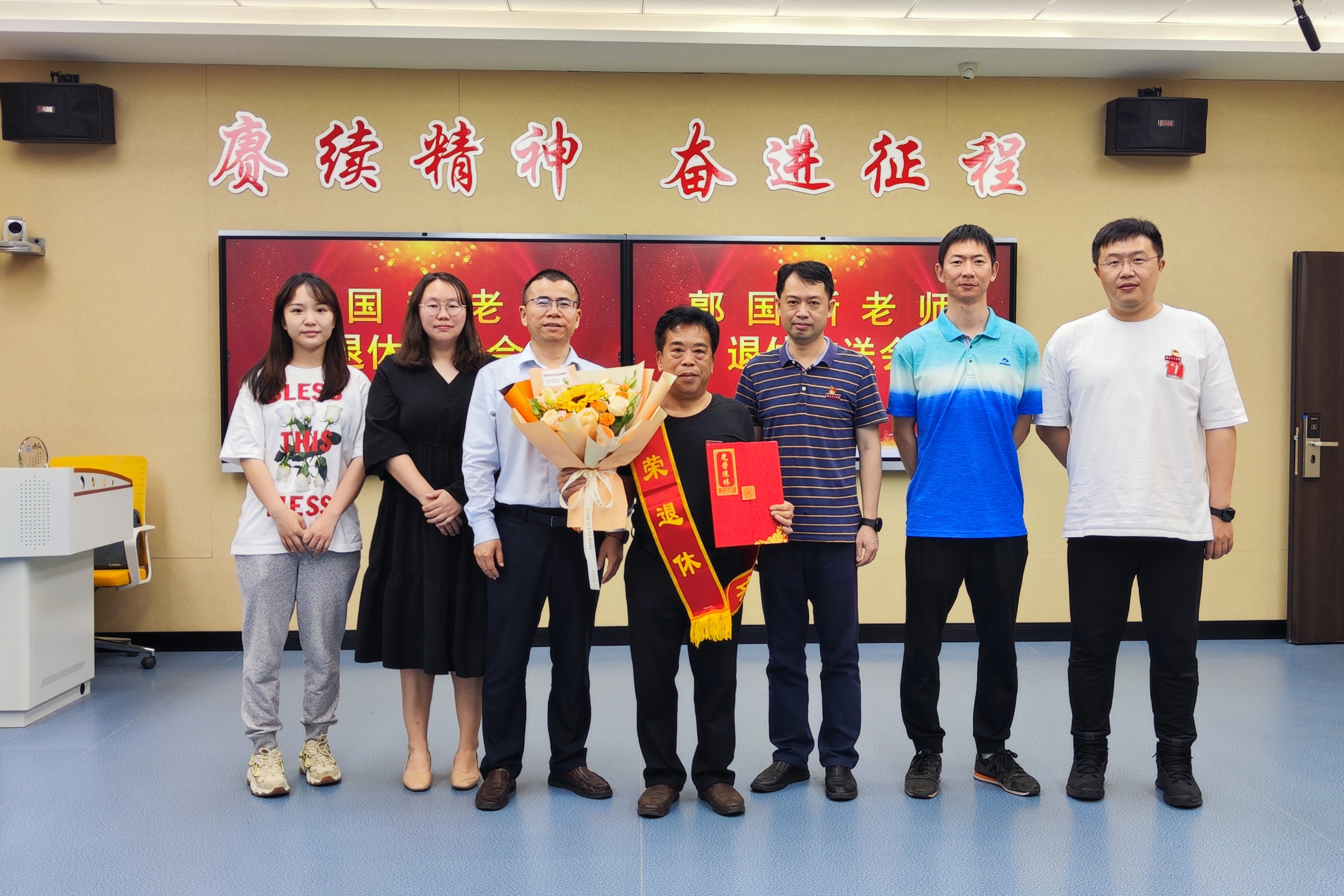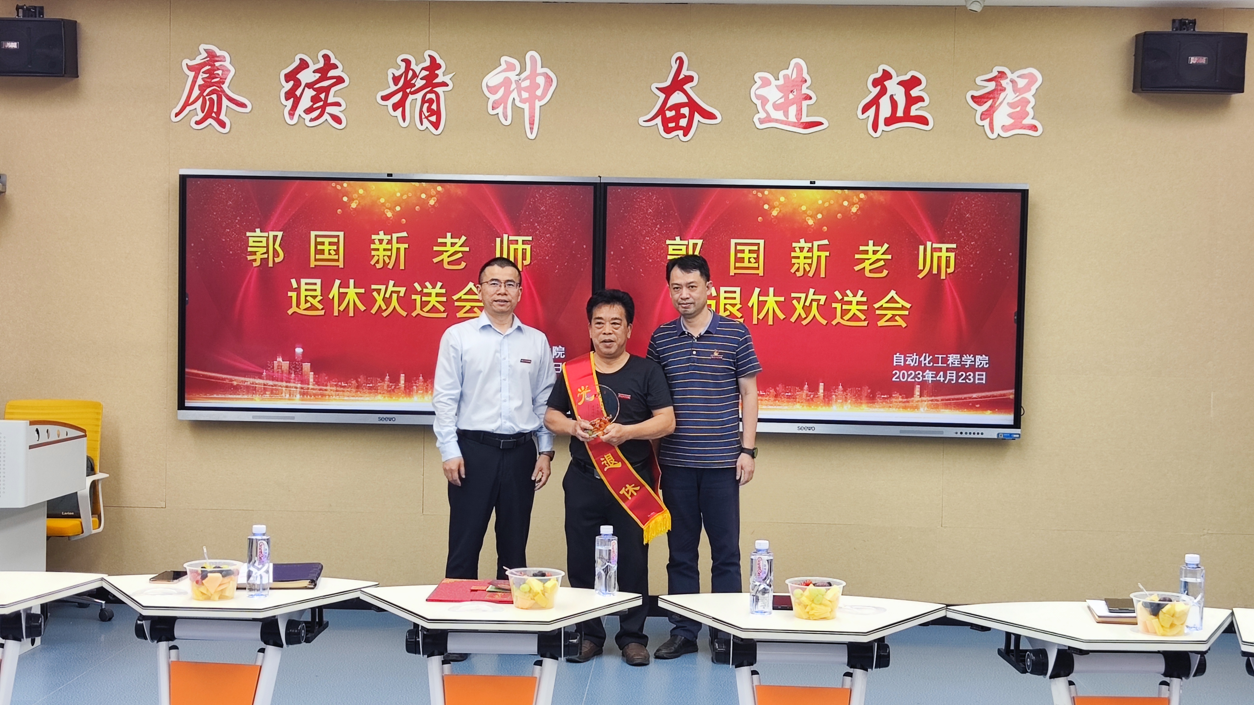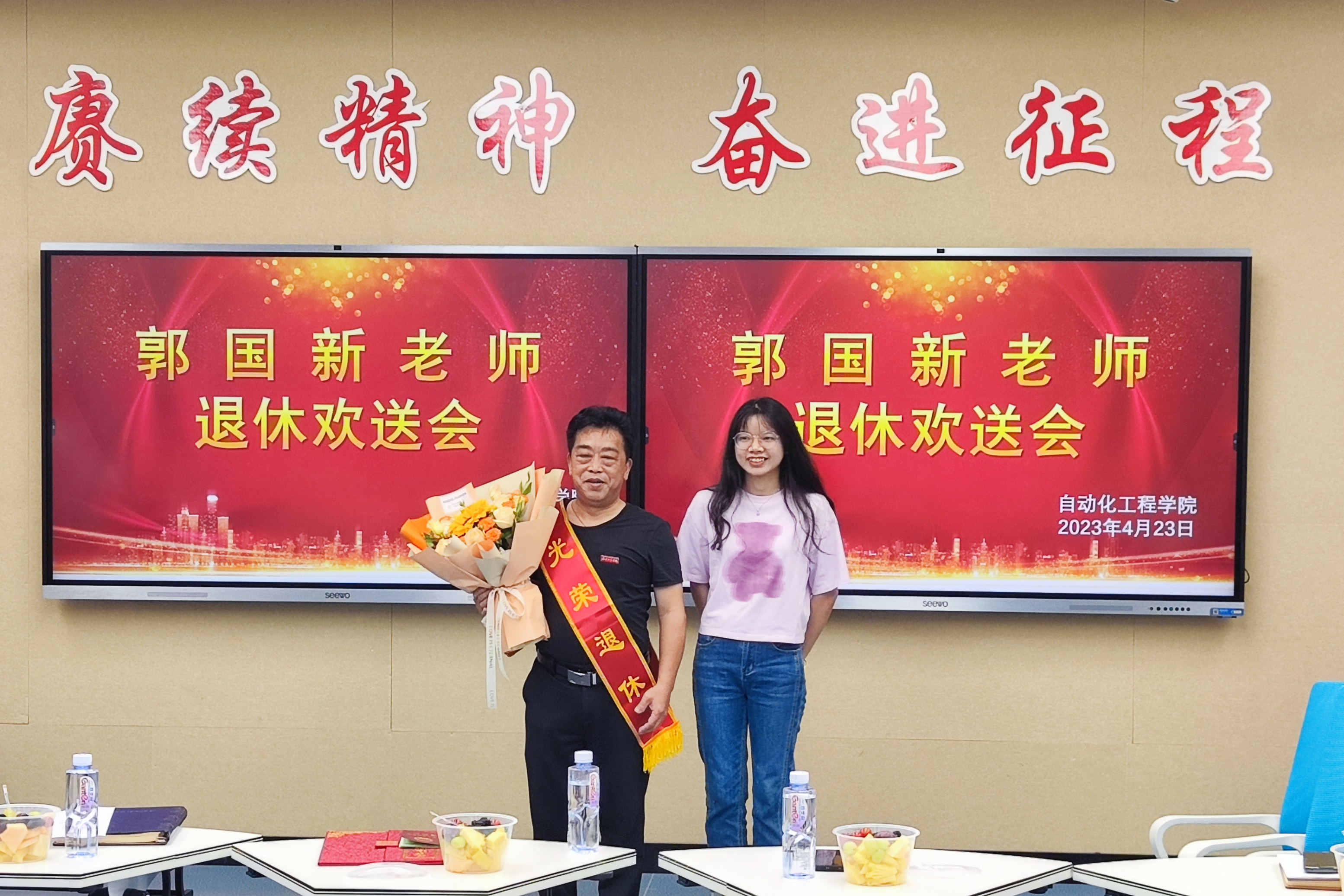 最后,自动化学院班子向郭国新老师献上了“光荣退休”绶带和退休纪念品,朱文珍作为青年教师代表向老同志鲜花。仪式在隆重和温馨的氛围中圆满结束。