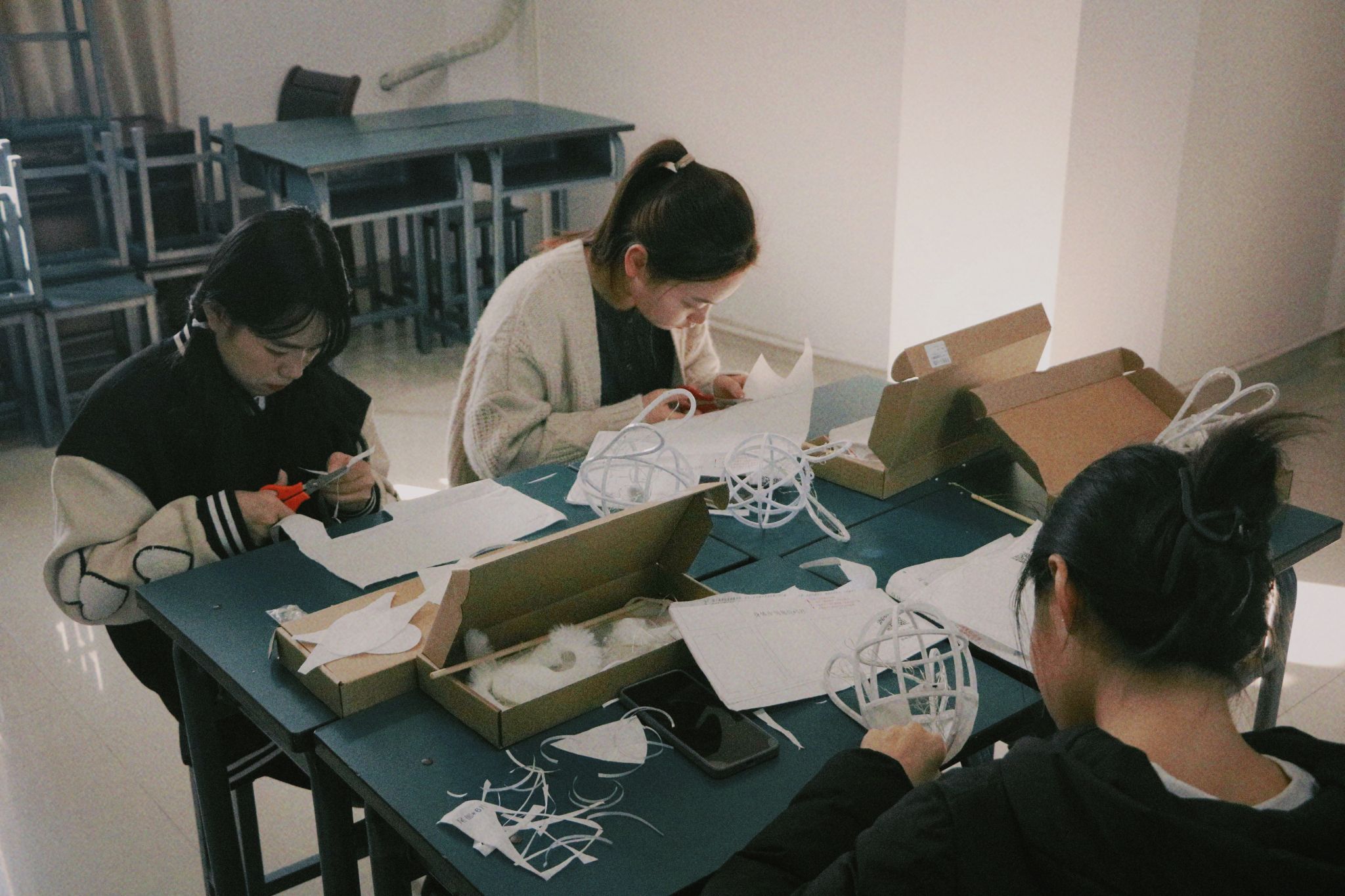 在校内活动中,许多师生参与花灯制作,现场气氛热烈,工作人员一边向大家介绍灯笼的制作方法,一边亲自上手演示。师生们也纷纷拿起材料开始制作花灯,一边看制作说明,一边听工作人员讲解,完全沉浸在手工制作中。大家围坐一堂,一起做灯笼,传承民俗情。随着灯笼整体框架拼接完成,在师生间互相帮助下,大家用热熔胶将彼此的灯笼框架固定,再用剪刀将彩纸剪下粘贴到灯笼上,这样以来,一个完整的玉兔灯笼展现在大家眼前。