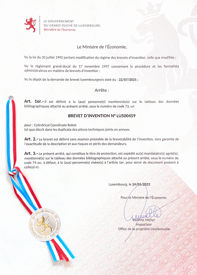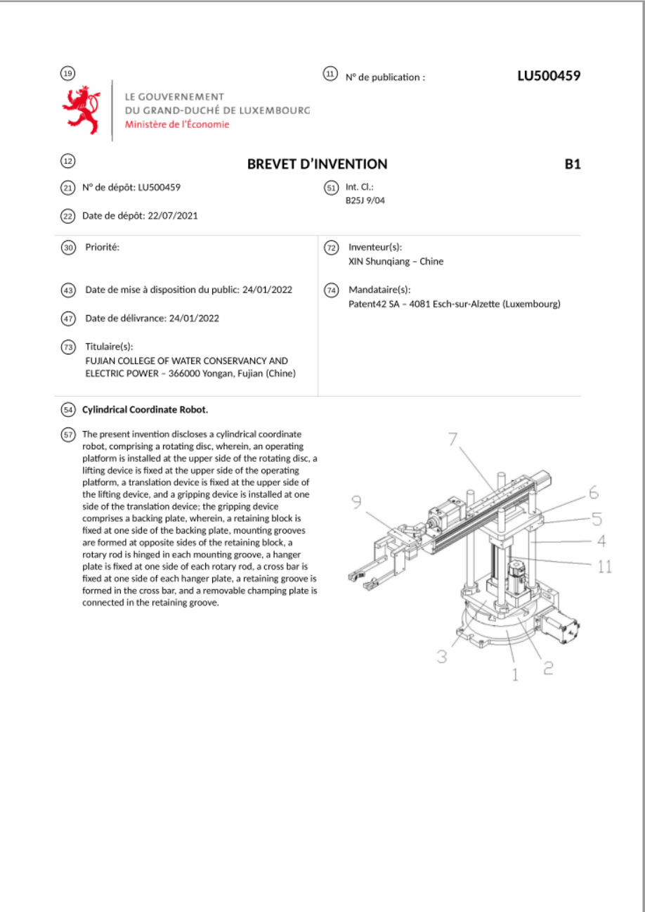 近日,自动化工程学院辛顺强技能大师工作室团队设计的一款圆柱坐标机器人正式获得欧洲专利授权。这是学院获得的首个国际授权的发明专利。该成果依托我院技能大师工作室平台研发,具有完全自主知识产权。