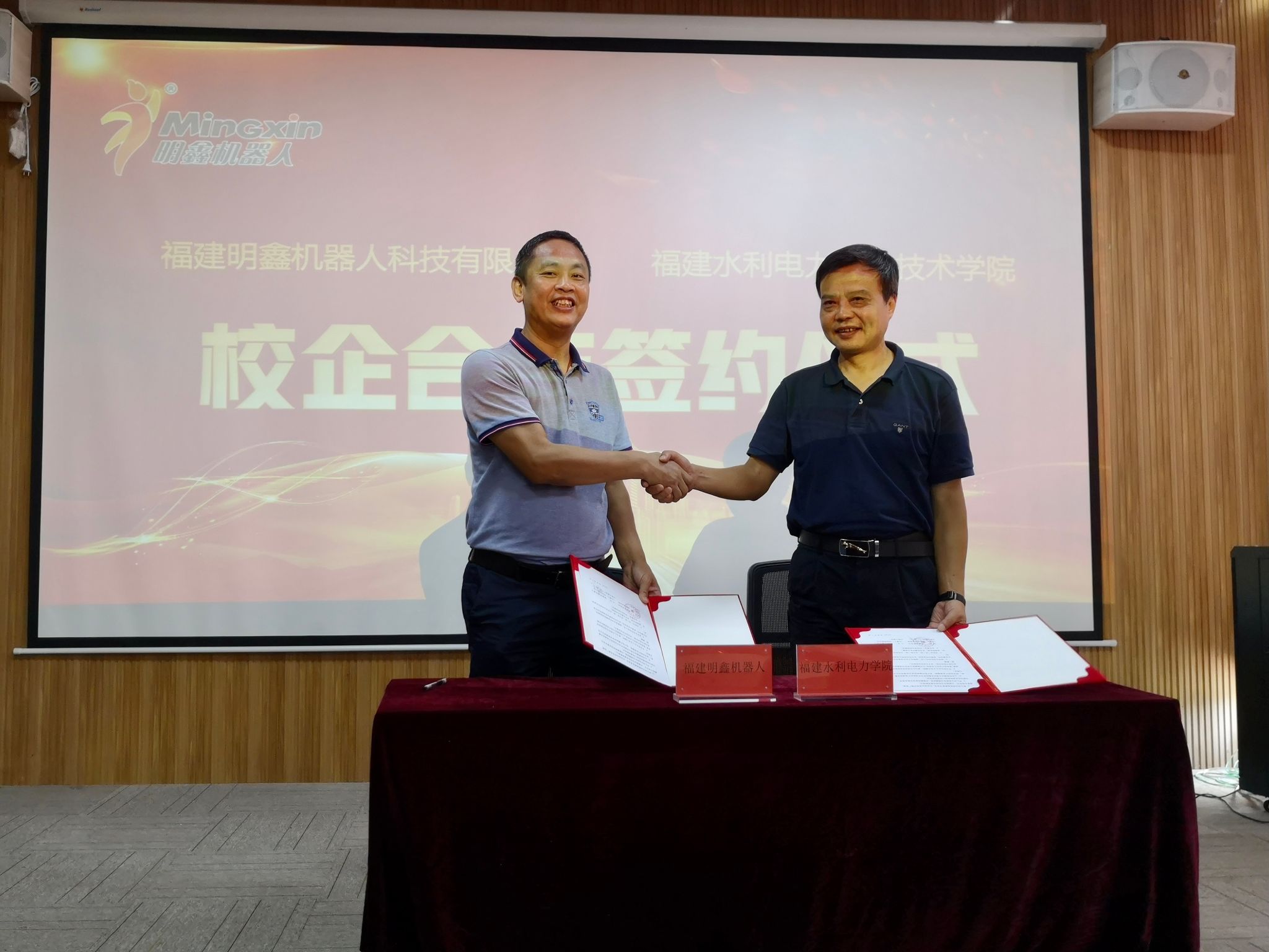 福建明鑫机器人科技有限公司总经理曾伟明及公司高管热情介绍了公司基本情况,双方就校企合作进行了深入洽谈,并签署了《校企合作协议》。协议的签订,助力双方技术交流与分享,促进我院人才培养质量,推进科技成果转化,全面推进产学研用合作落地,为后续双方专业技术人员的互聘和项目合作打下良好的基础。