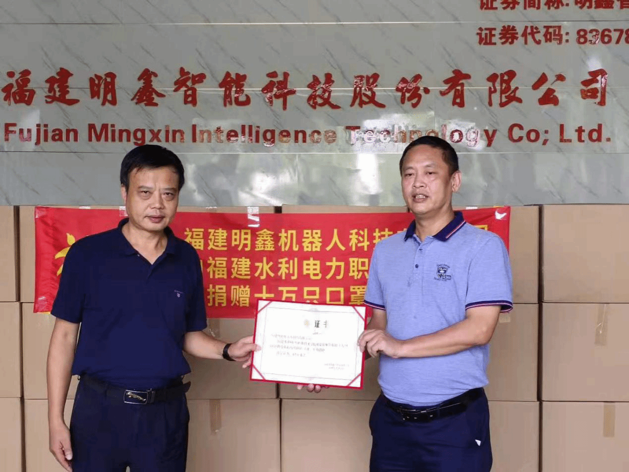 据悉,福建明鑫机器人科技有限公司还向我院慷慨捐赠10万只口罩,助力我院疫情防控工作,暖心护助学子们安全开课。李建平代表学院感谢公司的慷慨捐赠并为公司总经理曾伟明颁发了捐赠证书。