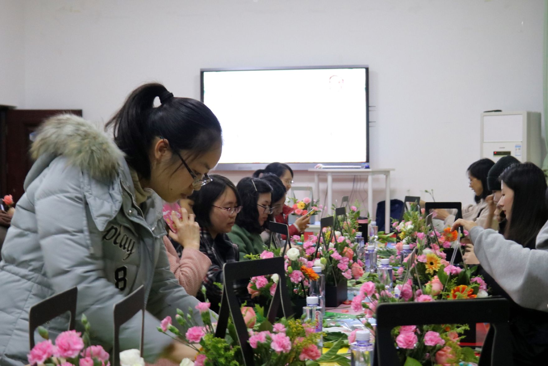 以花感人,以花育人,在辛勤工作与学习之余享受不一样的花样年华。3月7日下午,为庆祝“三八”国际妇女节的到来,机电工程系在“水云间”开展了“春暖花开,诗情花艺”花艺沙龙体验活动,17名女教师及37名女学生参加了本次活动。