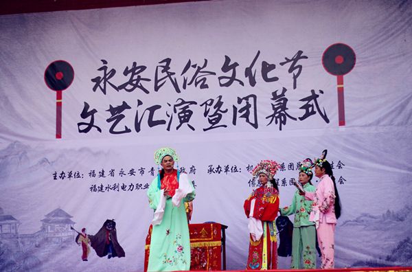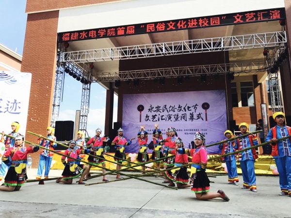 活动现场,国家非物质文化遗产——大腔戏的传承艺人精心装扮,热闹出场,生动的表演将历史人物刻画得栩栩如生;永安青水畲族传统民俗项竹竿舞、祭祀舞以创新互动的方式展示在同学面前,热情似火的场面感染了现场观众,不少学生也纷纷加入跳竹竿舞;学习大腔戏等体验项目也让同学们有了一次与民俗文化近距离接触的机会。