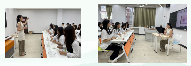 郑舒琦首先为现场的同学们带来茶文化分享,对茶叶历史文化进行深入讲解,了解六大茶类及基础冲泡知识、行茶礼仪礼等,让同学们对茶有了全面的认识和了解。同时对行茶器具也做了详细介绍,并从温杯烫盏、赏茶、投茶、注水、出汤、分茶这几个基本步骤为大家讲解行茶过程,现场示范冲泡茶的流程,动作行云流水、尽显优雅。最后,现场指导同学们茶具摆放、礼仪手位、站姿、形态以及行走的步伐等要领,规范走姿站姿、面部表情和眼神。