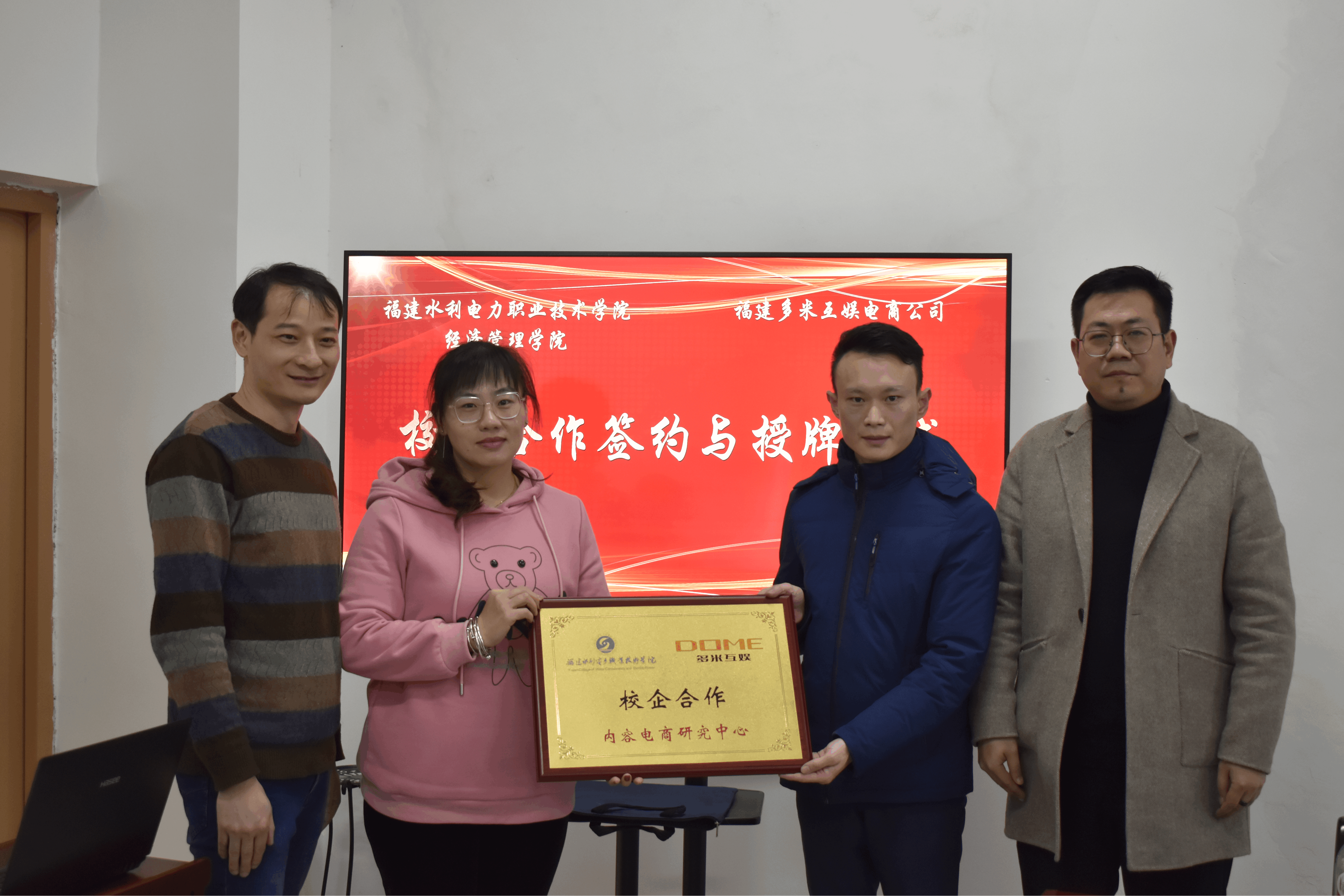 在与会人员共同见证下,双方代表签署校企合作协议,互相授予经济管理学院产教融合基地、内容电商研发中心,经济管理学院教师企业实践工作站,多米互娱内容电商(新媒体)人才培养基地等。