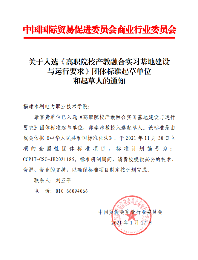 为贯彻落实全国职业教育大会、《教育部等九部门关于印发〈职业教育提质培优行动计划(2020—2023年)〉的通知》(教职成〔2020〕7号)精神,推动产教融合实习实训基地建设,进一步规范实习基地建设要求,提升高职院校就业质量,中国国际贸易促进委员会商业行业委员会依据《中华人民共和国标准化法》,立项了《高职院校产教融合实习基地建设与运行要求》(项目计划编号为:CCPIT-CSC-JH2021185)团体标准。