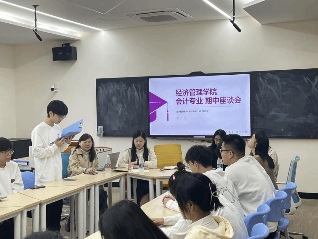 11月23日上午,2021级会计专业师生在智慧教室6-506汇聚一堂,开展师生座谈会,会计教研室副主任蔡隽含,专业教师周国福,陈淑云,陈思瑶,谢清晓,谢诗颖,2021级会计专业学生代表50余人参加座谈会,座谈会由辅导员周析亚主持。