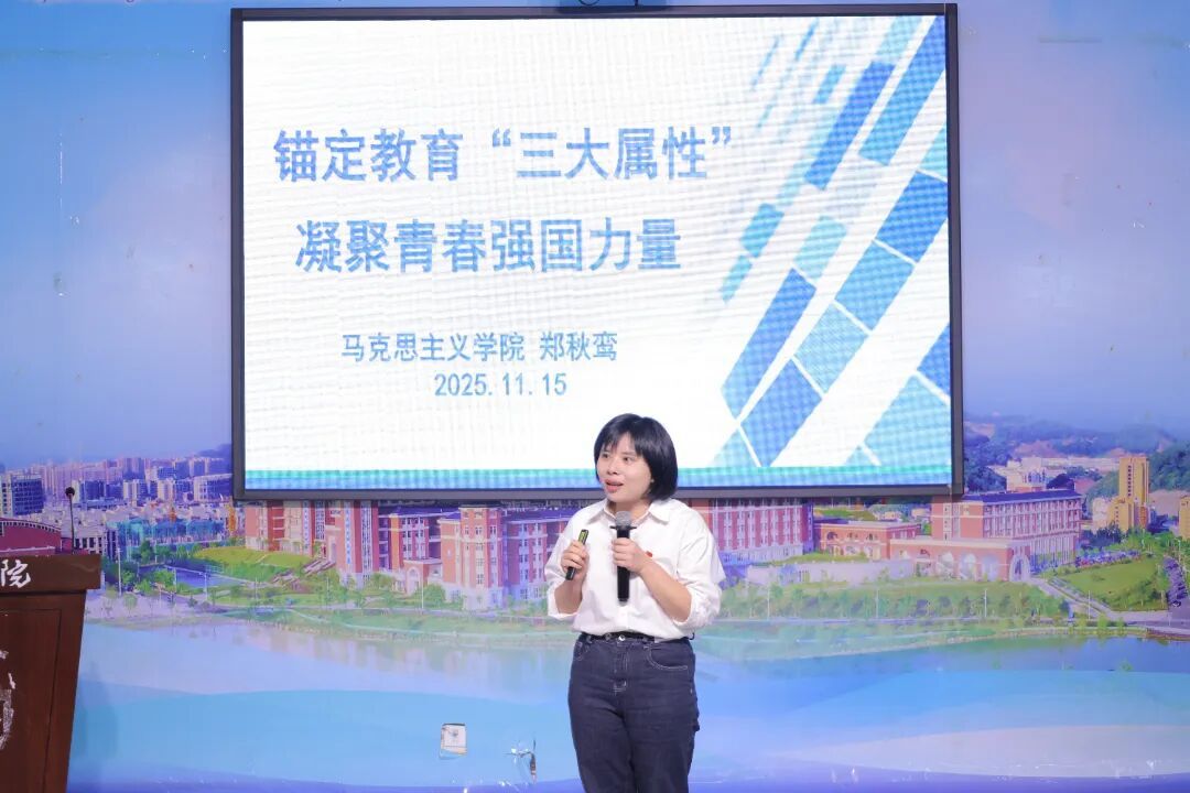 专家专题赋能,凝聚强国力量。特邀学生公寓8栋思政导师、马克思主义学院教师郑秋鸾,带来题为《锚定教育“三大属性”凝聚青春强国力量》的理论专题讲座。郑秋鸾结合身边案例,系统解读“三大属性”的核心要义与时代内涵,鼓励青年学子将个人理想融入强国建设、民族复兴的伟大征程,扛起新时代赋予的光荣使命,为学员们注入强大的精神动力。