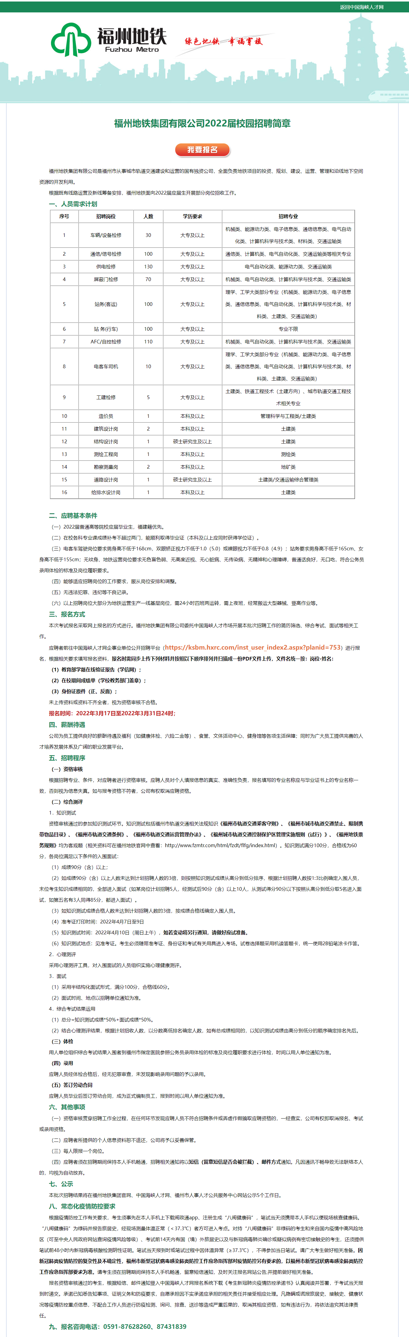 招聘信息| 福州地铁集团有限公司2022届校园招聘简章