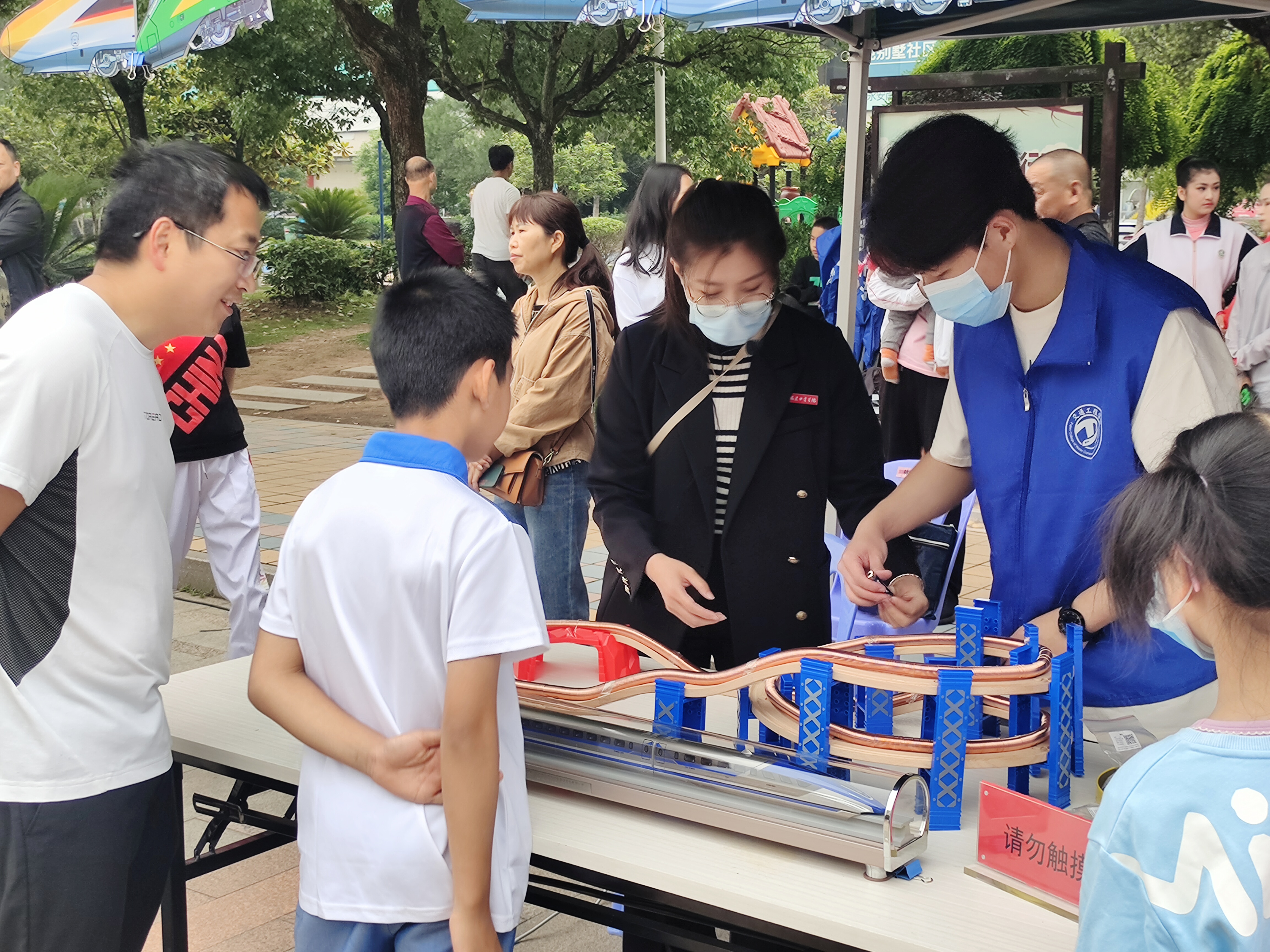5月13日,福建水利电力职业技术学院联合永安市人民政府在文体休闲广场共同举办“2023年职业教育活动周暨科技活动周”启动仪式,交通工程学院设置磁悬浮高铁技术技能展示展台。在技能展示区,志愿者们通过磁悬浮建模、高铁模型、的展示,向家长及孩子们有趣的介绍了磁悬浮的原理和各类高铁的性质以及主要用途;在技能体验区,志愿者们通过有趣的快问快答和模型组装吸引了参观的市民们参与到实践体验中。