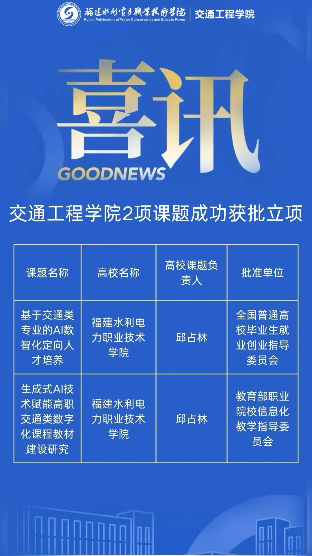 交通工程学院邱占林老师主持的课题《基于交通类专业的AI数智化定向人才培养》成功入选教育部供需对接就业育人项目第四期立项项目,同时邱占林老师主持的课题《生成式AI技术赋能高职交通类数字化课程教材建设研究》获得教育部职业院校信息化教学指导委员会批准立项。