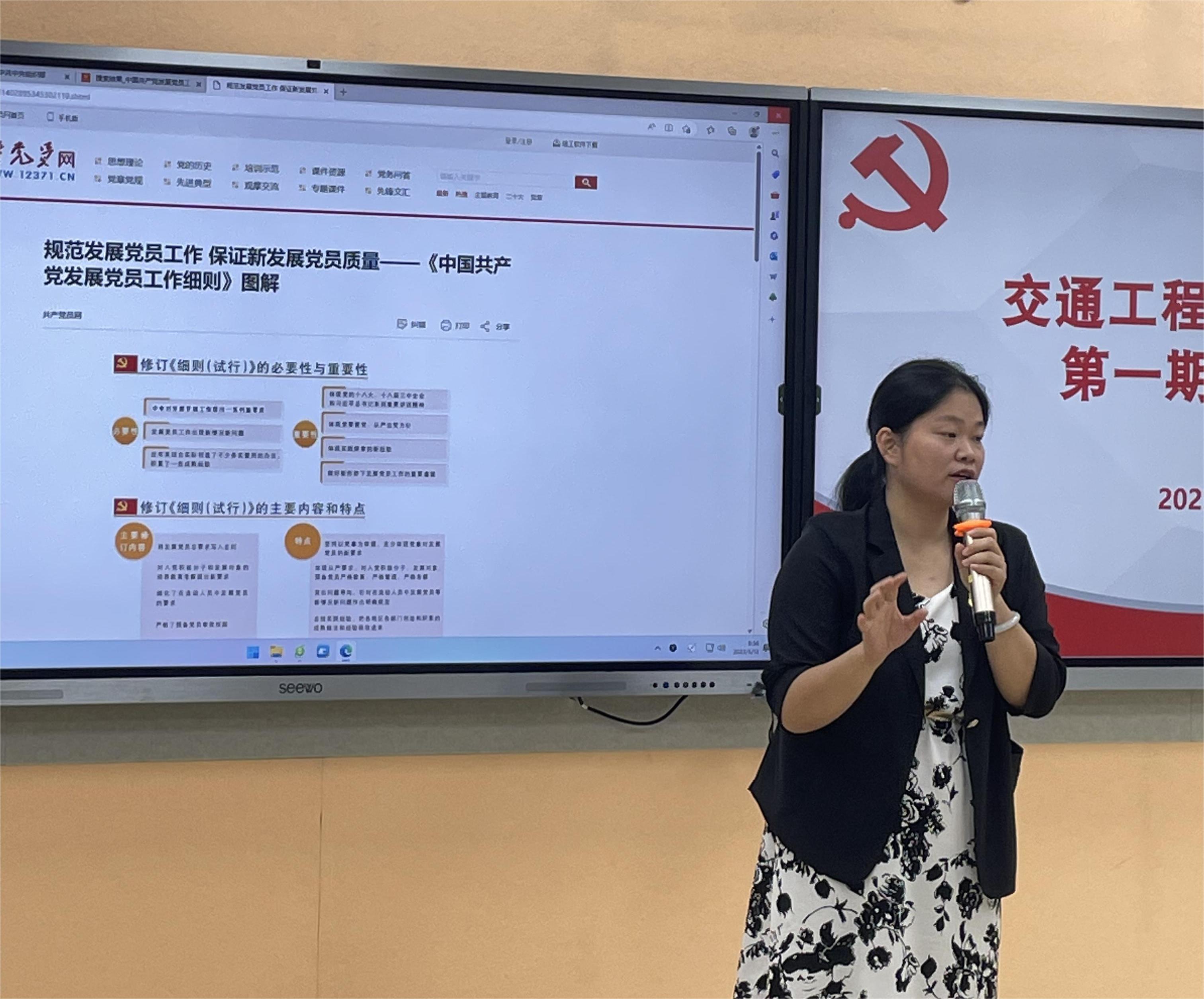 淬炼初心使命,蓄足源头活水。为切实加强入党积极分子队伍建设,提高入党积极分子的思想觉悟,保证发展党员质量,2023年5月13日上午,在禹兴园6栋405智慧教室,交通工程学院专职组织委员邓婷婷以《始终坚持人民至上的价值追求--学习贯彻习近平新时代中国特色社会主义思想》为主题,讲了一堂生动的党课。交通工程学院2023年第一期党校培训全体学员参加听课。