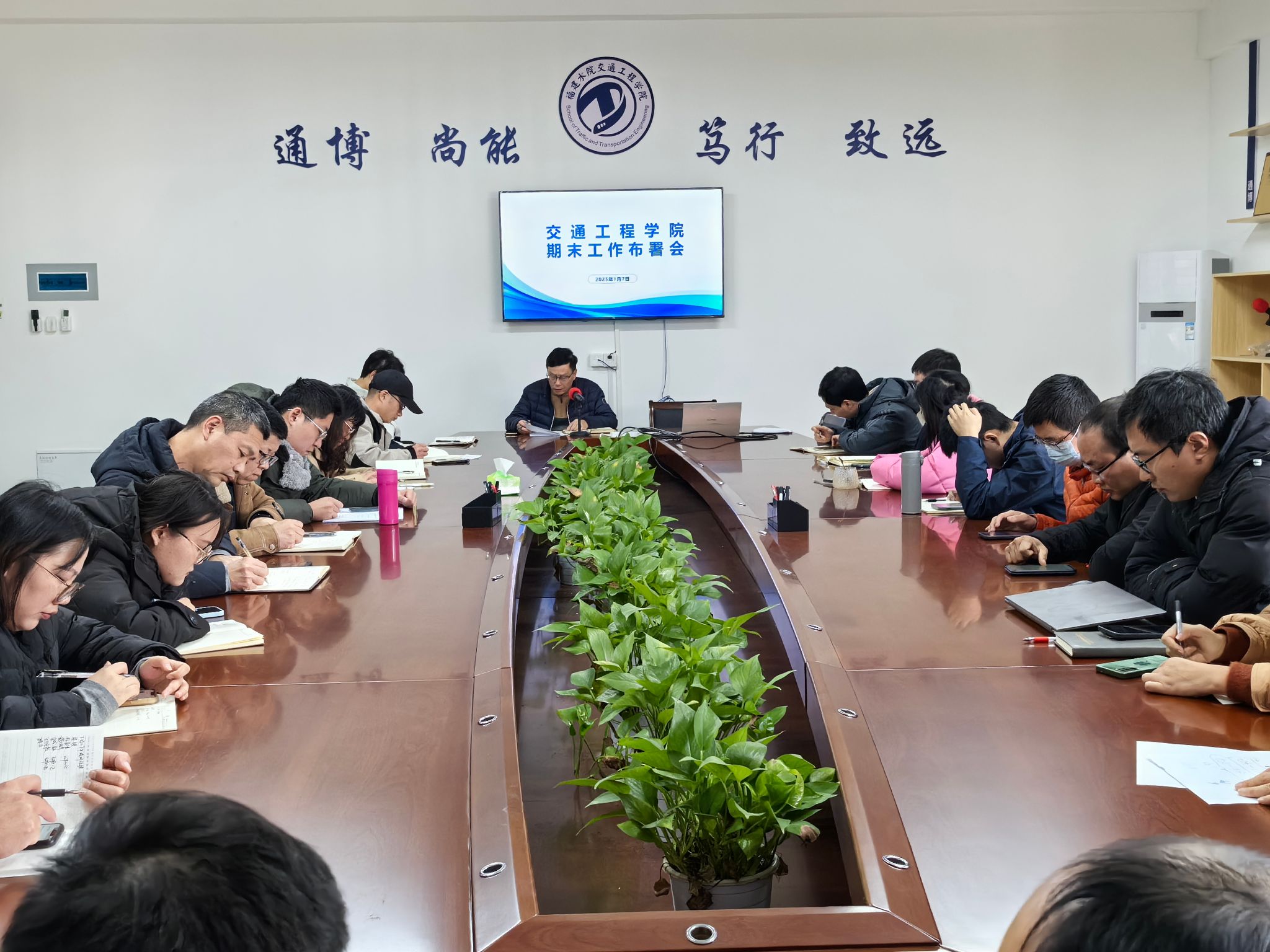 2025年1月7日下午,交通工程学院在李冰园1五楼会议室召开期末工作部署会,学院领导班子成员、全院教职工参加会议,会议由院长谢珍贵主持。