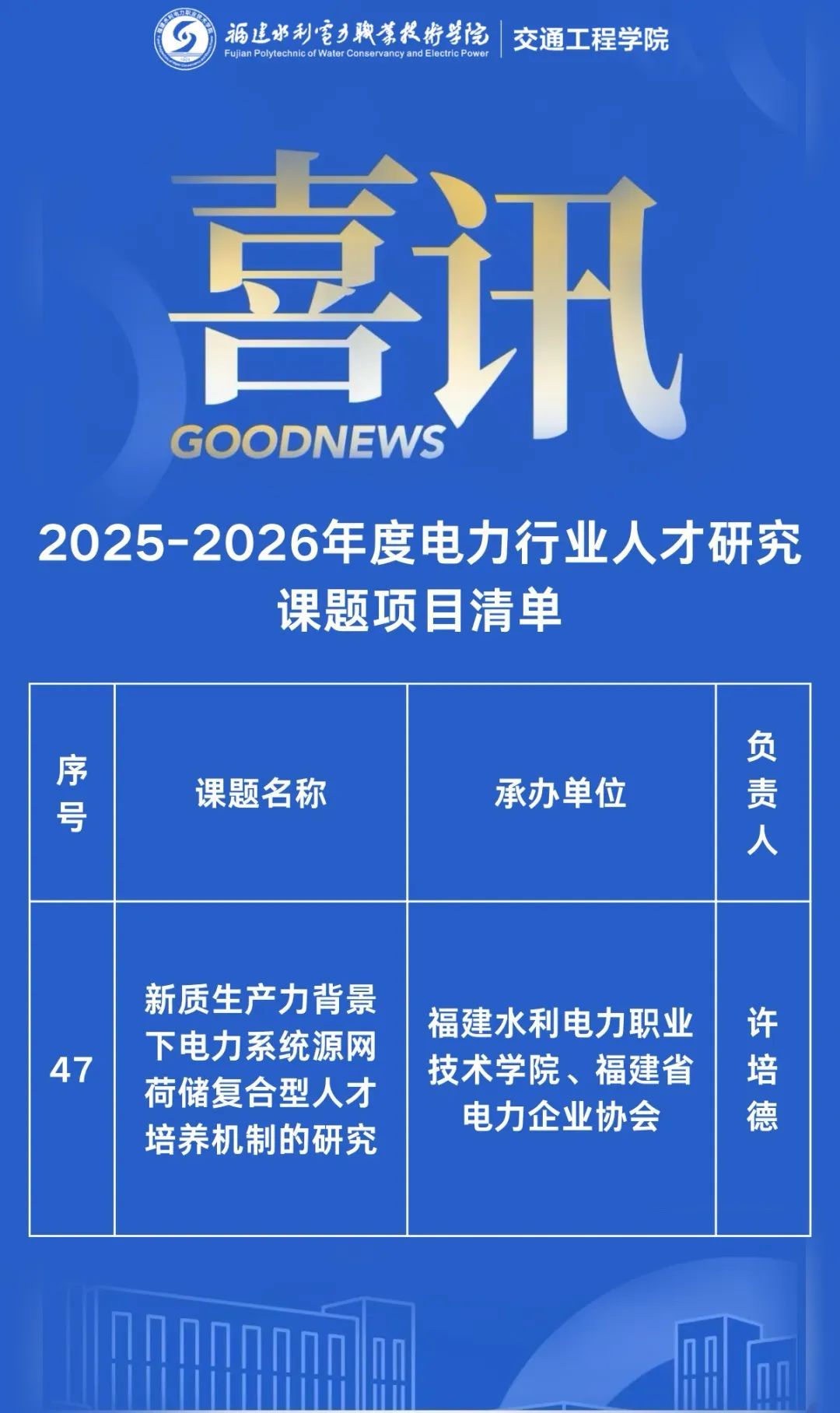 日前,电力行业职业技能鉴定指导中心公布了2025-2026年度课题立项名单,交通工程学院许培德老师主持的课题《新质生产力背景下电力系统源网荷储复合型人才培养机制的研究》成功获批立项。该课题将聚焦交通运输领域碳达峰碳中和人才培养痛点,通过调研行业岗位需求、梳理核心能力体系,探索 “政校企协” 协同育人路径,计划构建课程模块、实践平台、评价标准三位一体的培养机制,为加快建设交通强国和新型能源体系输送适配新发展需求的专业人才。