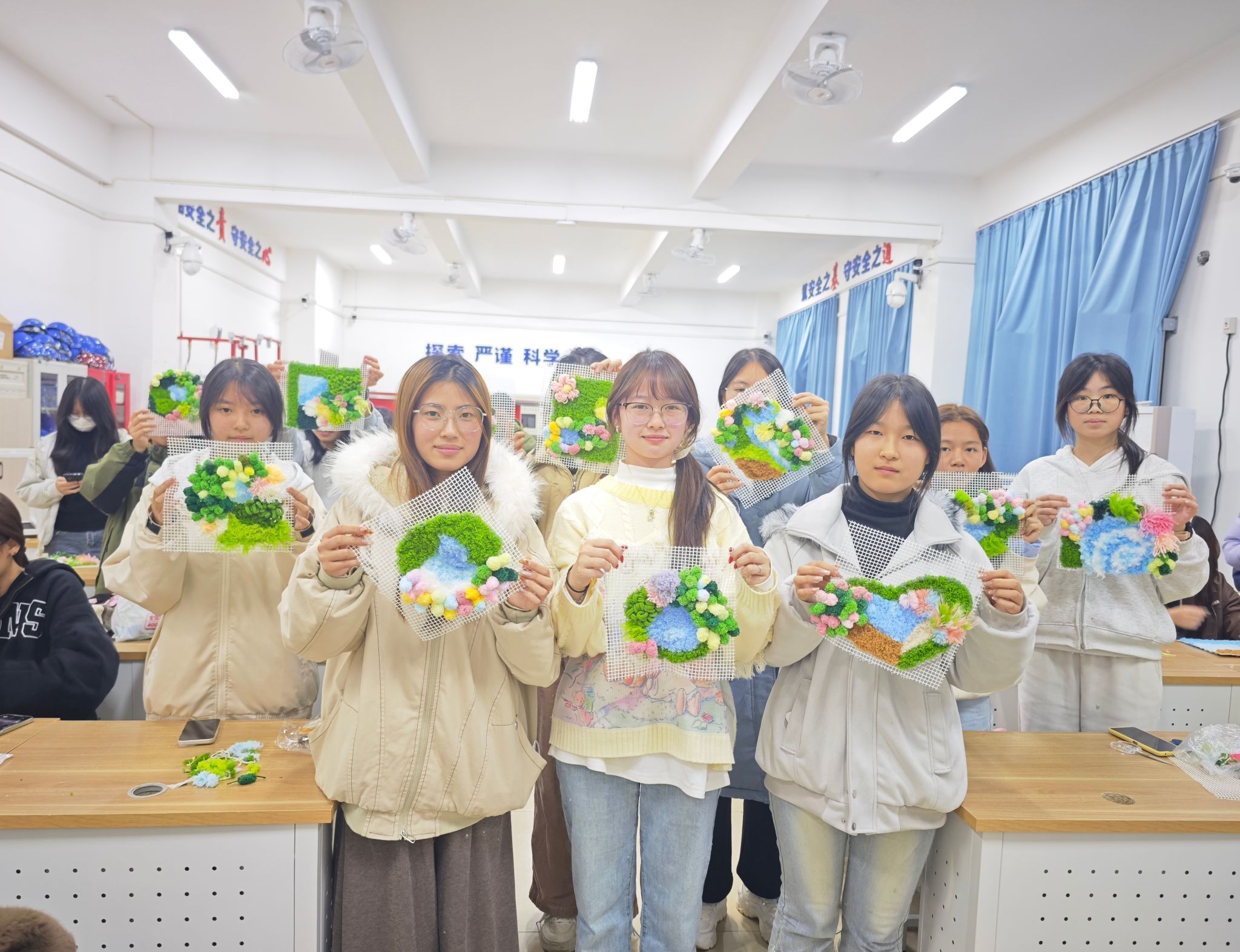 实践过程中,学生们专注投入,在钩针起落与彩线缠绕间,一件件兼具艺术性与创意性的苔藓主题手作作品顺利完成。同学们既掌握植物主题手作的基础技能,更在观察植物形态、提炼美学元素、完成创意创作的过程中,有效提升了审美感知与艺术表达能力。