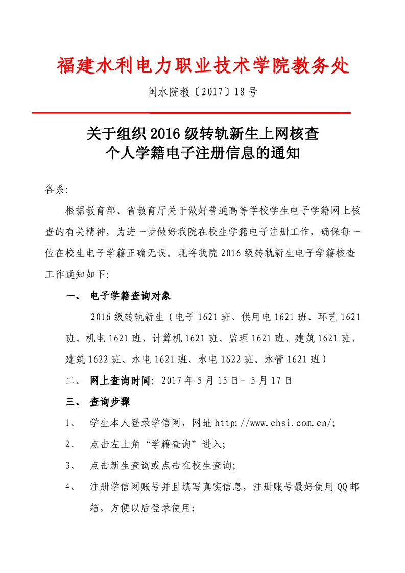 关于组织2016级转轨新生上网核查个人学籍电子注册信息的通知