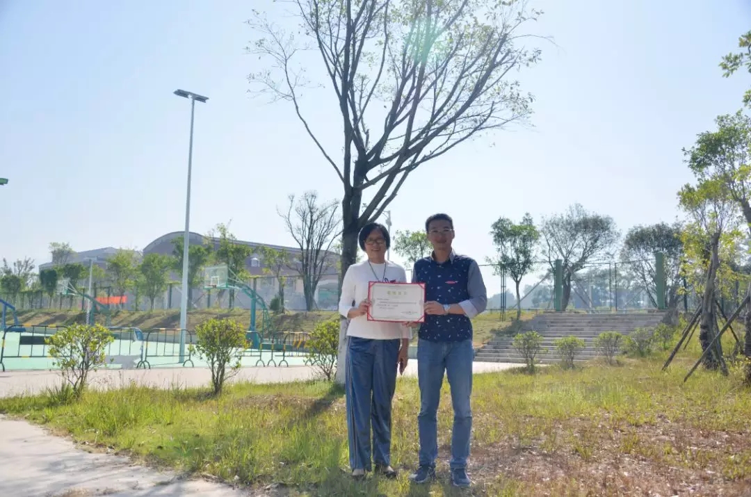 水电0351班校友认捐学院篮球场旁红皮榕树一棵,班主任陈燕晖代表班级进行捐赠,学院党委副书记黄瑞梅为校友颁发捐赠证书。
