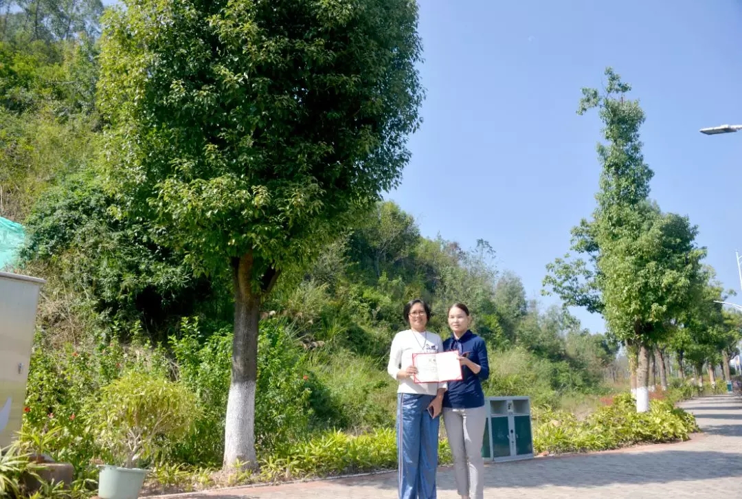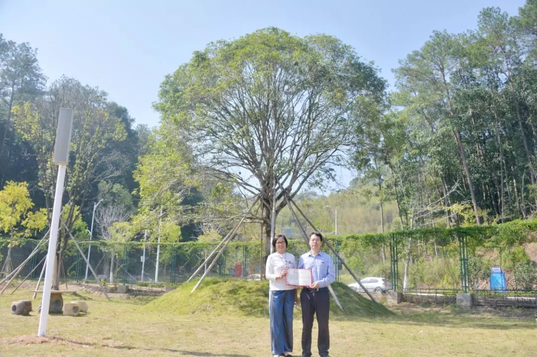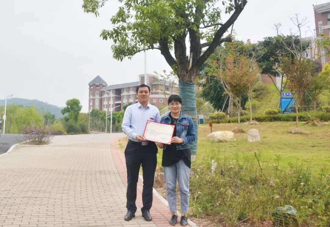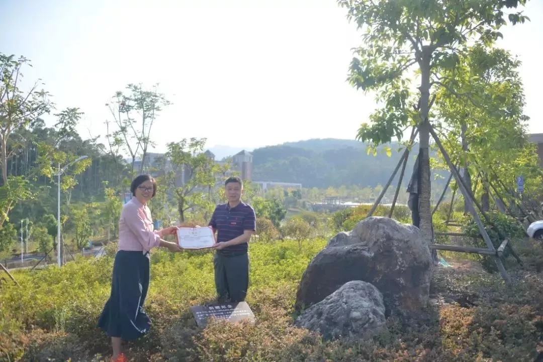 机电9941班校友认捐学院东大门东山路旁香樟树一棵,班主任陈燕晖代表班级进行捐赠,学院党委副书记黄瑞梅为校友颁发捐赠证书。