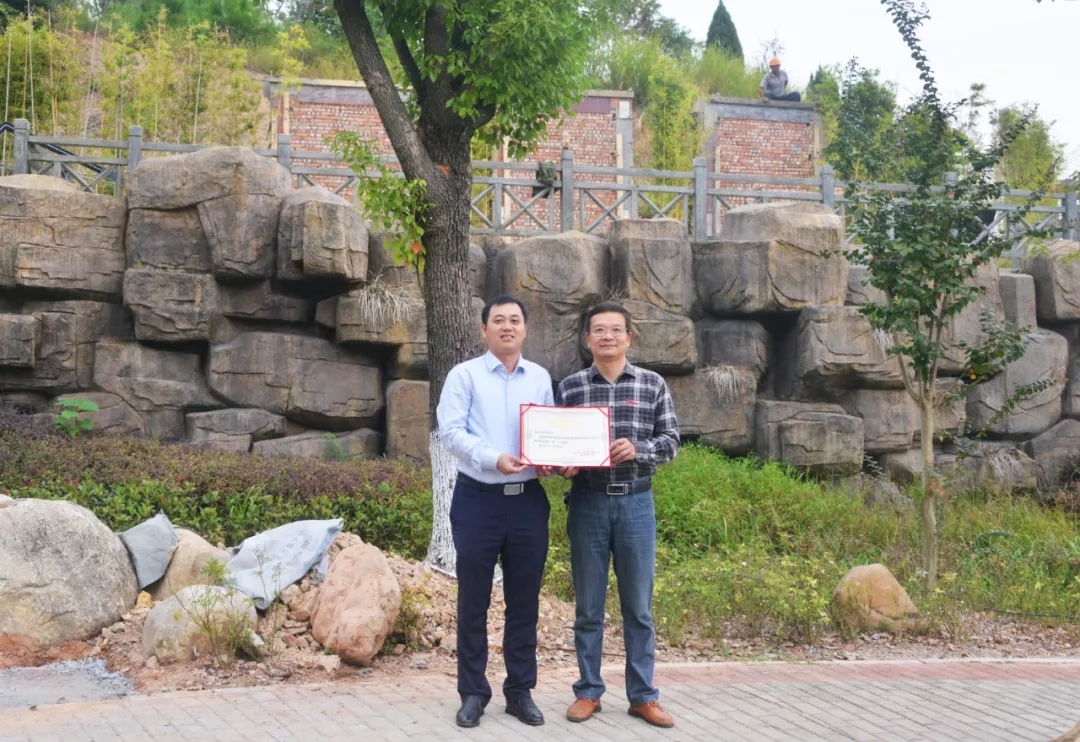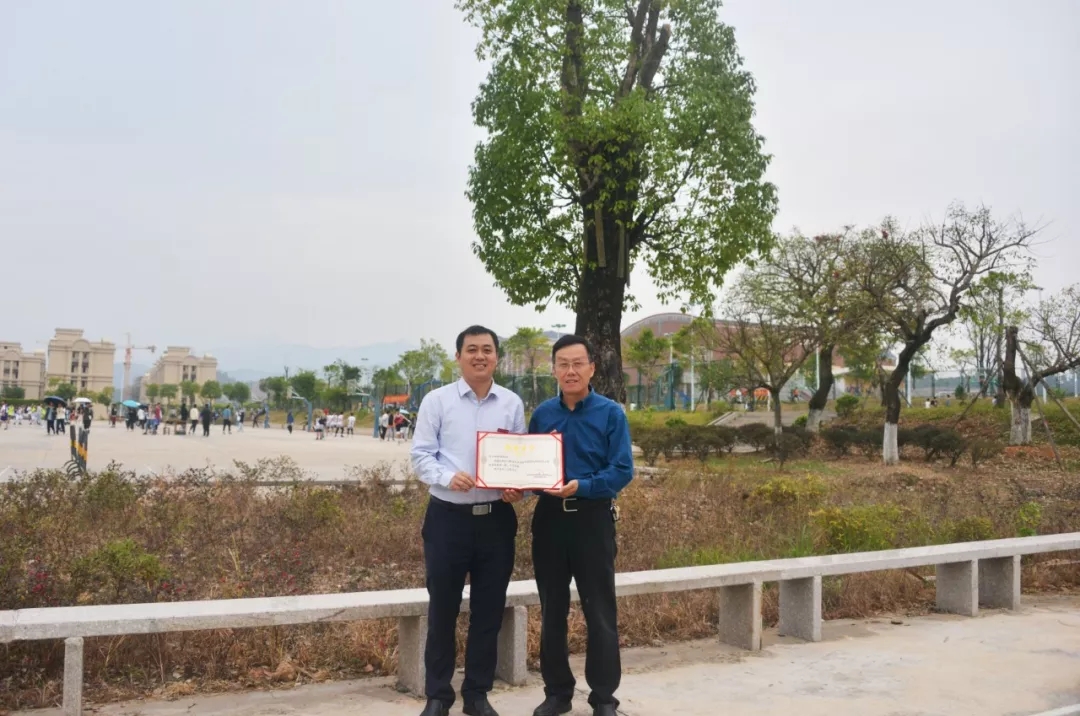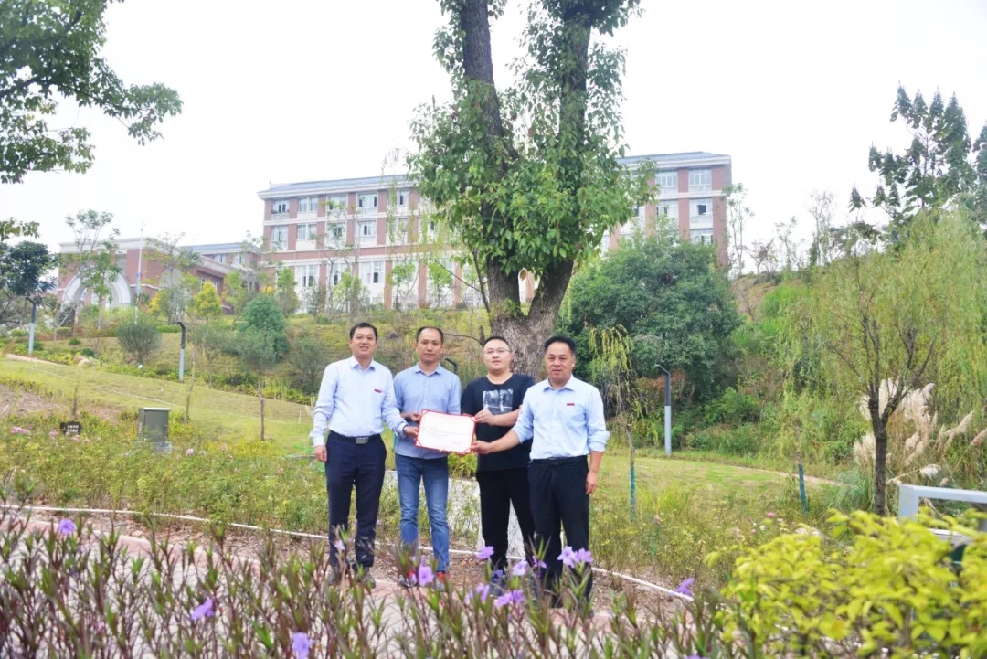 计算机9441班、水电0251班校友认捐学院翠竹园门口榕树一棵和景观休闲石桌椅,班主任张美新代表班级进行捐赠,学院副院长杨武盖为校友颁发捐赠证书。