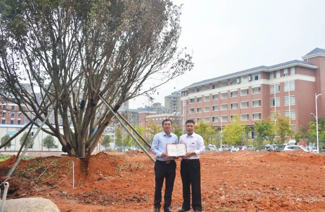 电设9433班校友认捐学院东大门东山路旁香樟树一棵,班主任陈金星代表班级进行捐赠,学院副院长杨武盖为校友颁发捐赠证书。