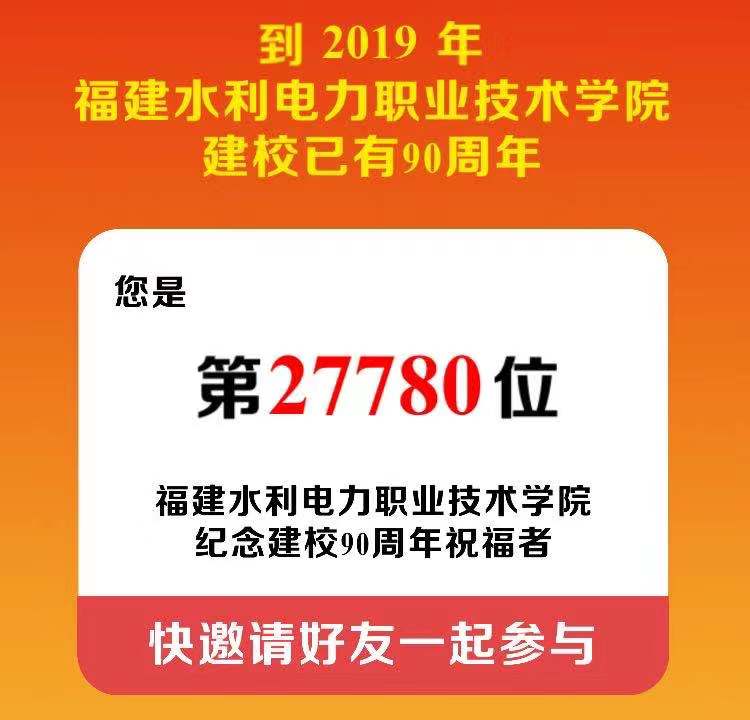 亲爱的水院 这是我第N+1次祝福您…… ↓↓↓ (点击图片,接力送祝福) 弹指九十年,桃李芬芳 转眼九十载,硕果累累 岁月的钟摆一刻不停 从1929年到2019年 福建水利电力职业技术学院 走过了90载春夏秋冬 激动地告诉大家 我们期待已久的校庆 只剩 5 天啦! 让我们携手所有水院人 一起为建校90周年纪念大会 接力送祝福吧! ↓↓↓ (点击图片,接力送祝福)