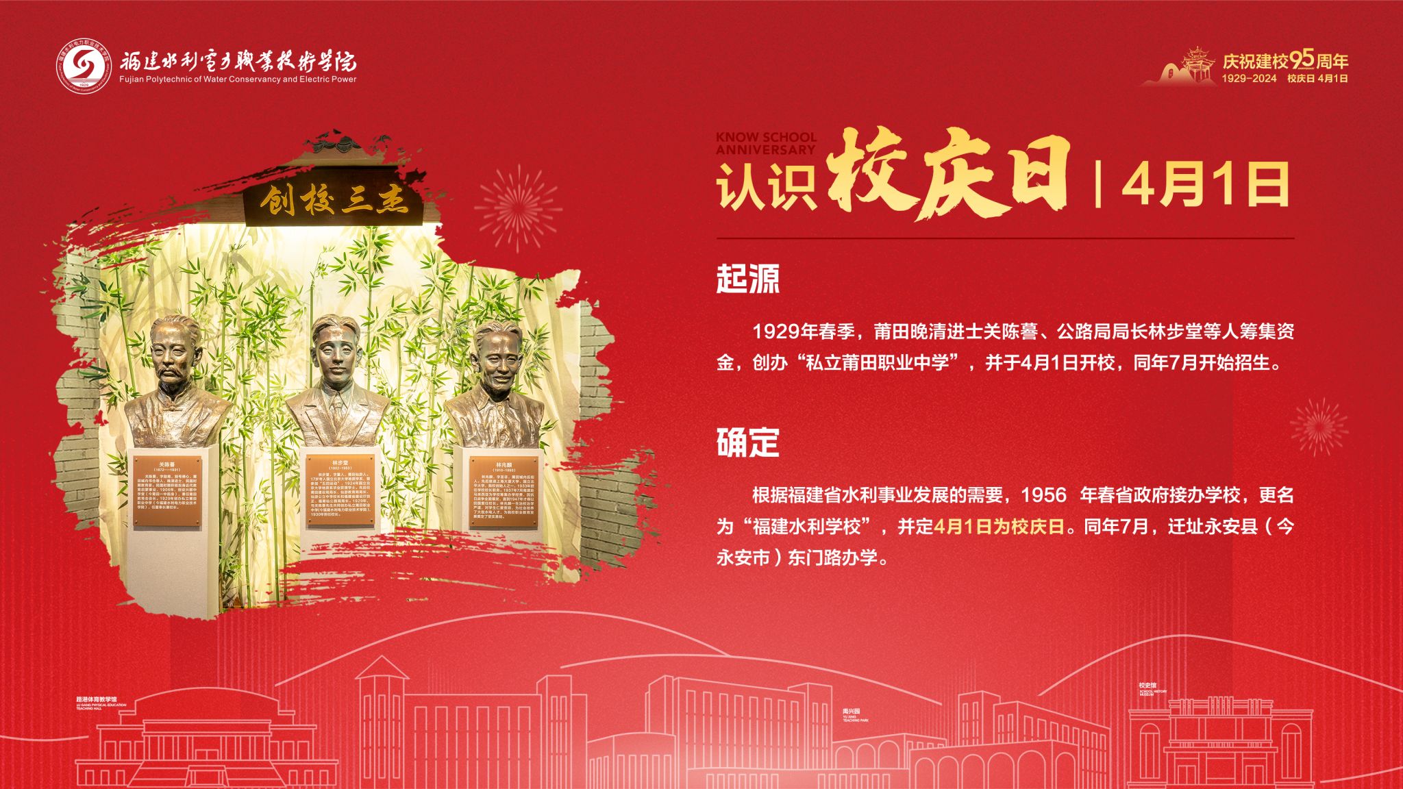 弦歌不辍,九十五载沧桑砥砺。与时偕行,九十五载岁月峥嵘。2024年4月1日,福建水利电力职业技术学院迎来建校95周年华诞。躬逢佳期,师生校友无不翘首以待,值此之际,我们由衷地向长期以来关心、支持和帮助学校教育事业发展的各级领导、社会各界宾朋、海内外校友以及全校师生员工致以最诚挚的感谢和最崇高的敬意!