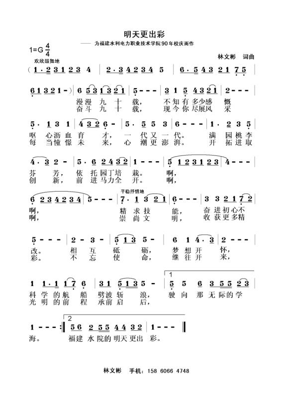 2、歌曲结构简洁工整,旋律流畅优美,节奏明晰,音域较窄(才9度)、时值适中,朗朗上口,适宜全体师生,学校的功能就是“教跟学”,因此,庆典歌内容一定要给辛勤的老师一定的板块。